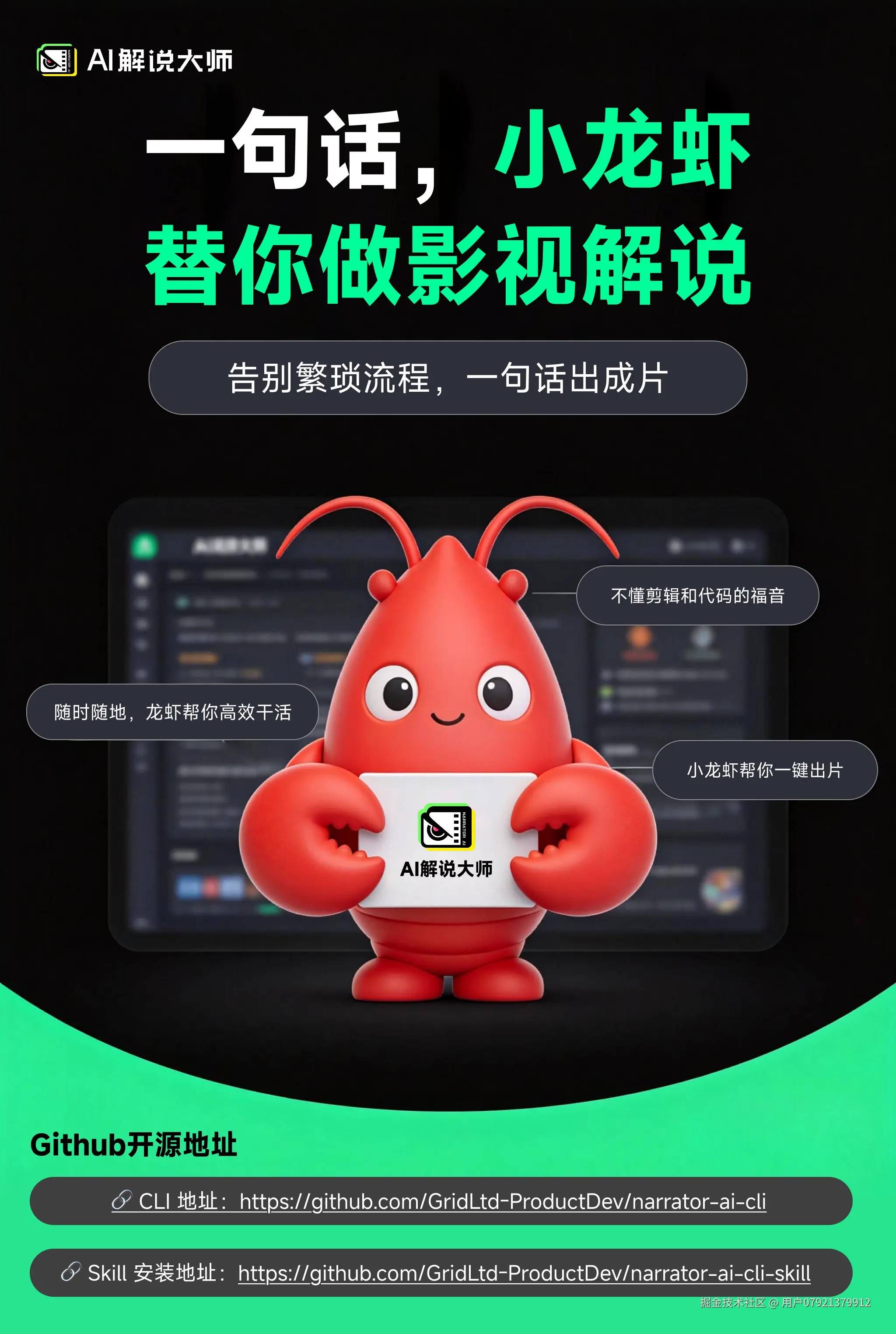 今天介绍的 narrator-ai-cli,是一款专为影视解说场景打造的命令行工具,基于AI解说大师开放接口实现全流程自动化。和同类 WebUI 工具最大的不同在于:CLI 架构让它可以被脚本调用、被 AI Agent 驱动,不只是一个手动操作的工具,而是一个可以接进自动化工作流的能力模块。