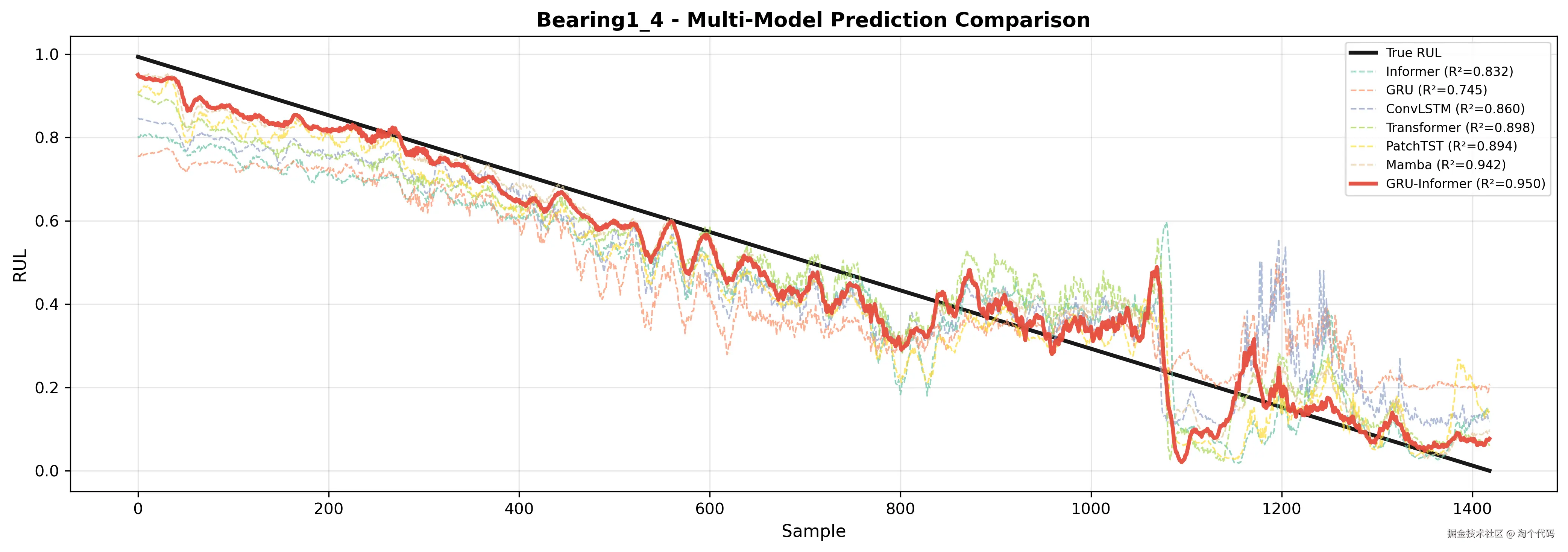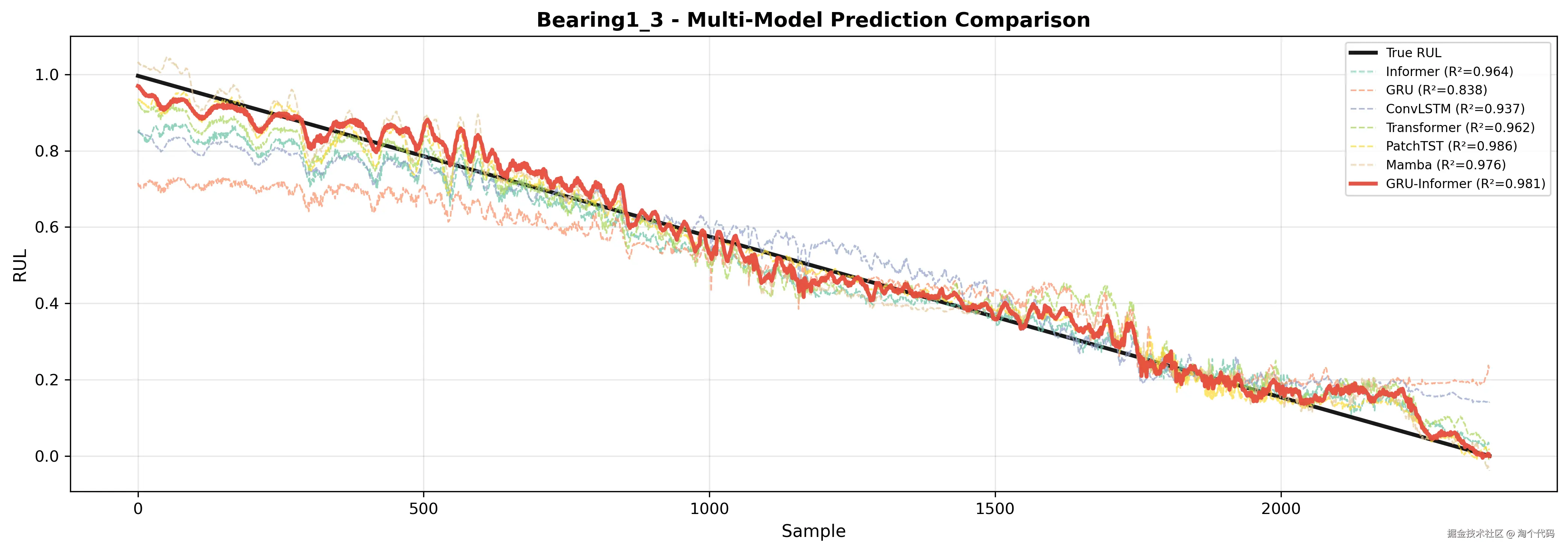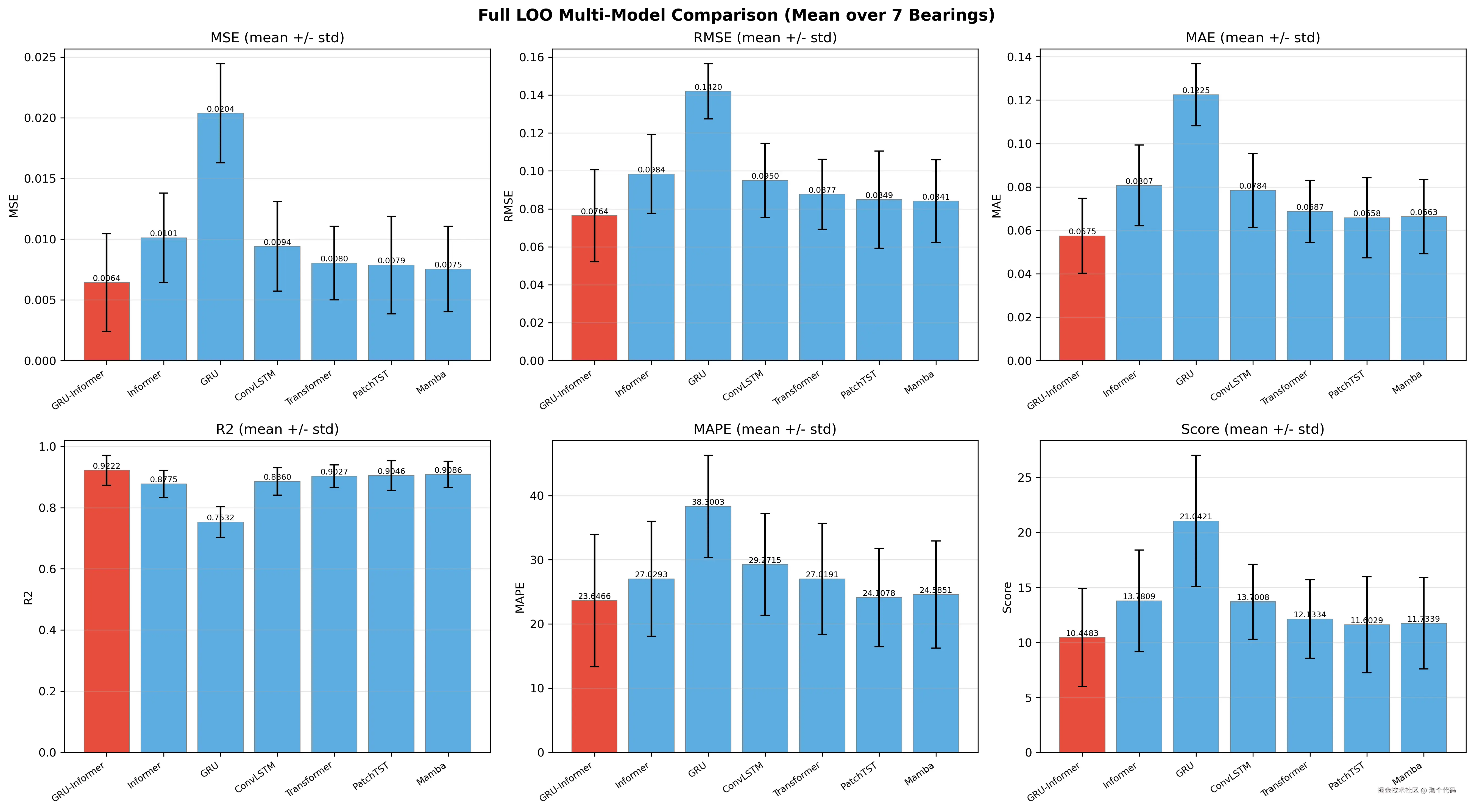 总之,你可以看到,本期推出的这个项目已经做好了所有的对比实验!在 PHM 2012 数据集上,GRU-Informer 模型取得了非常高的预测精度,优于纯 GRU、Transformer、Informer、PatchTST、Mamba 等对比模型。