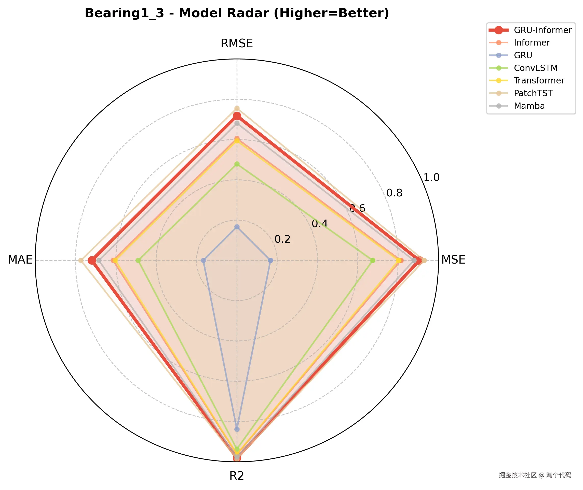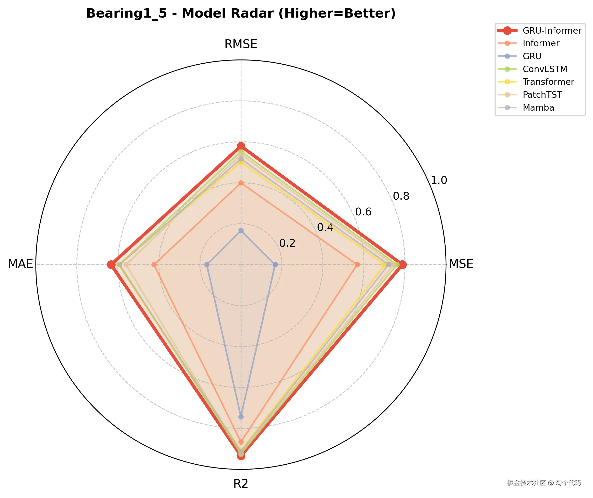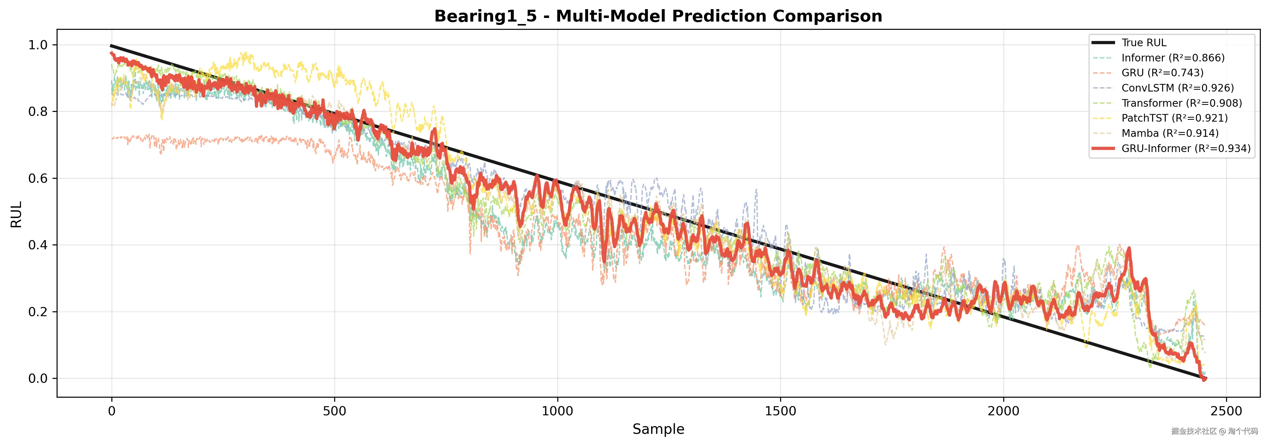 总之,你可以看到,本期推出的这个项目已经做好了所有的对比实验!在 PHM 2012 数据集上,GRU-Informer 模型取得了非常高的预测精度,优于纯 GRU、Transformer、Informer、PatchTST、Mamba 等对比模型。