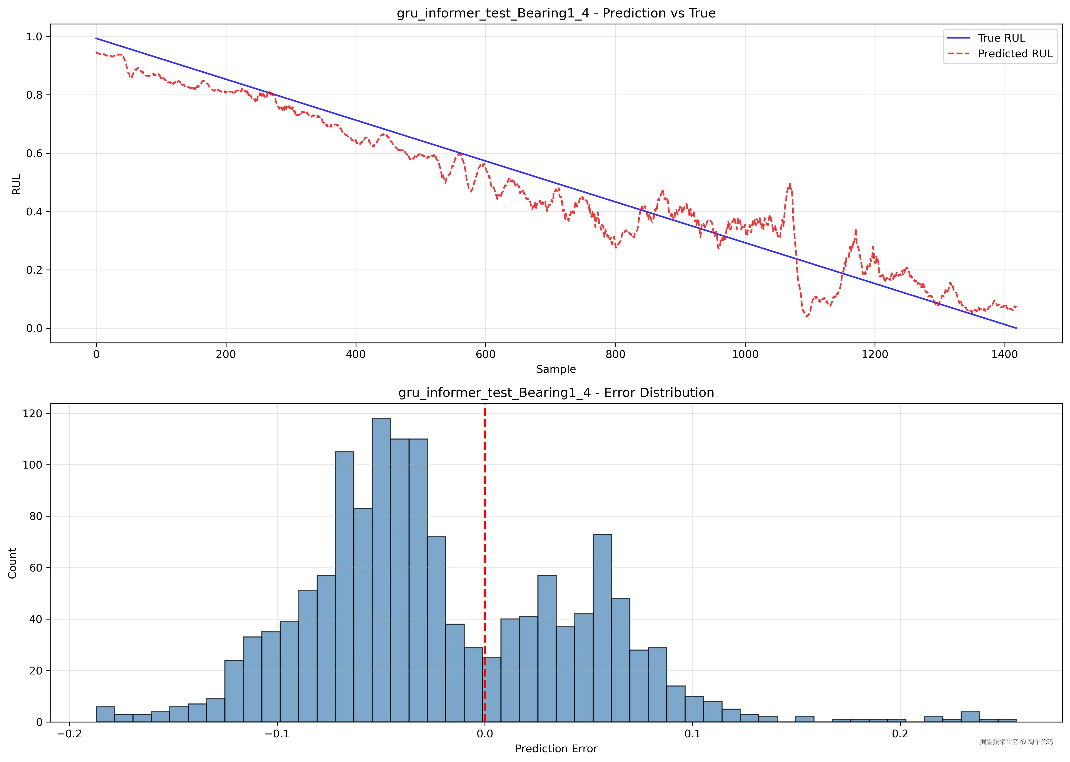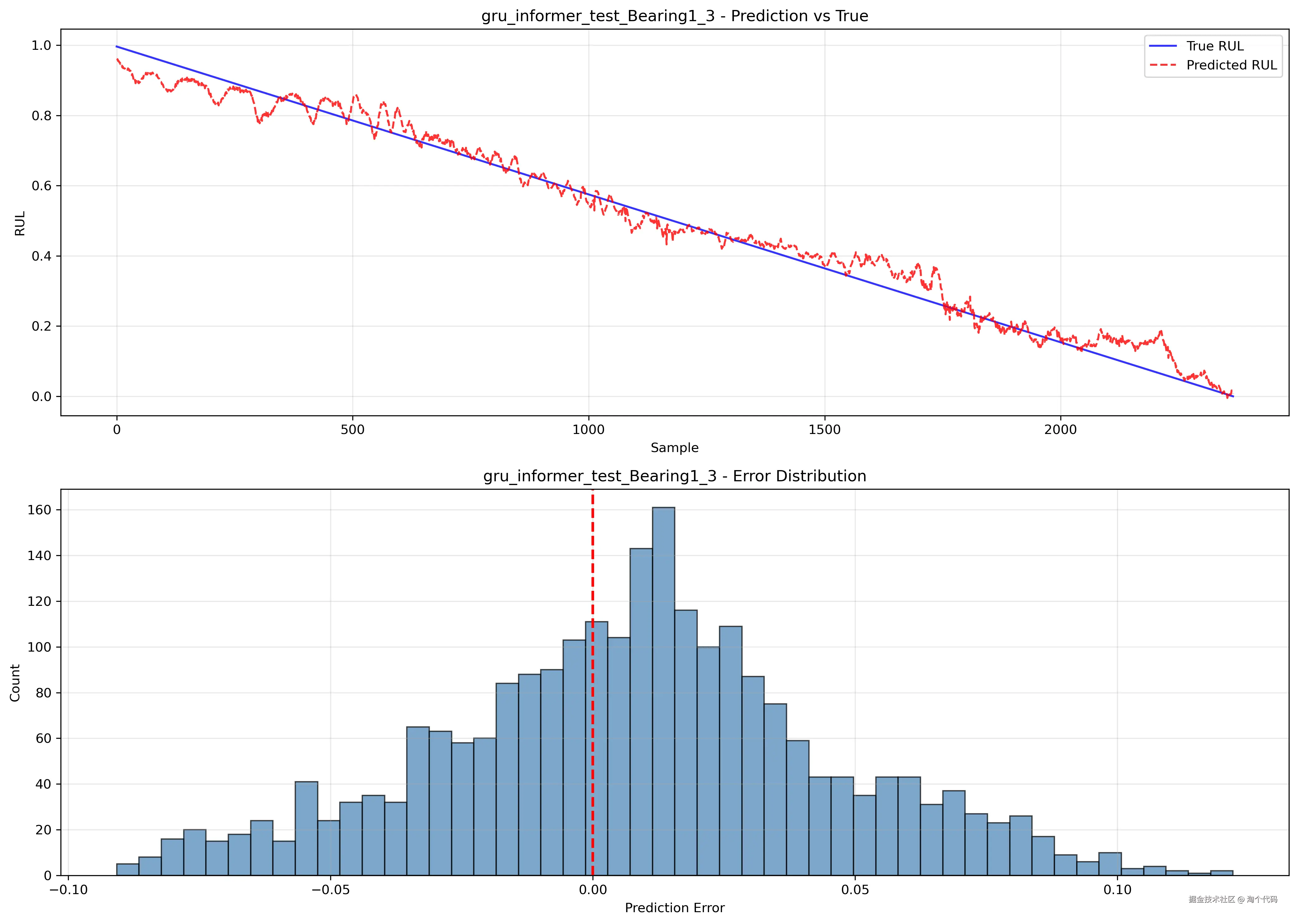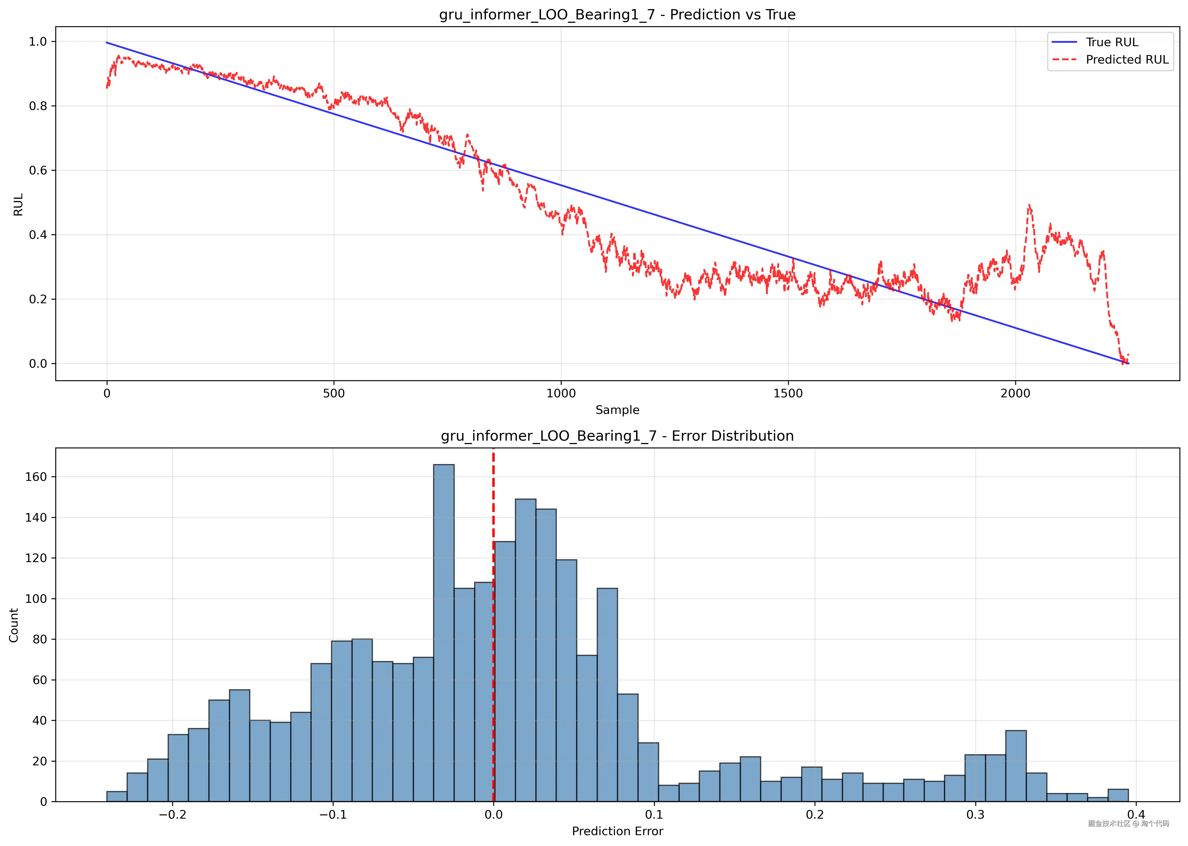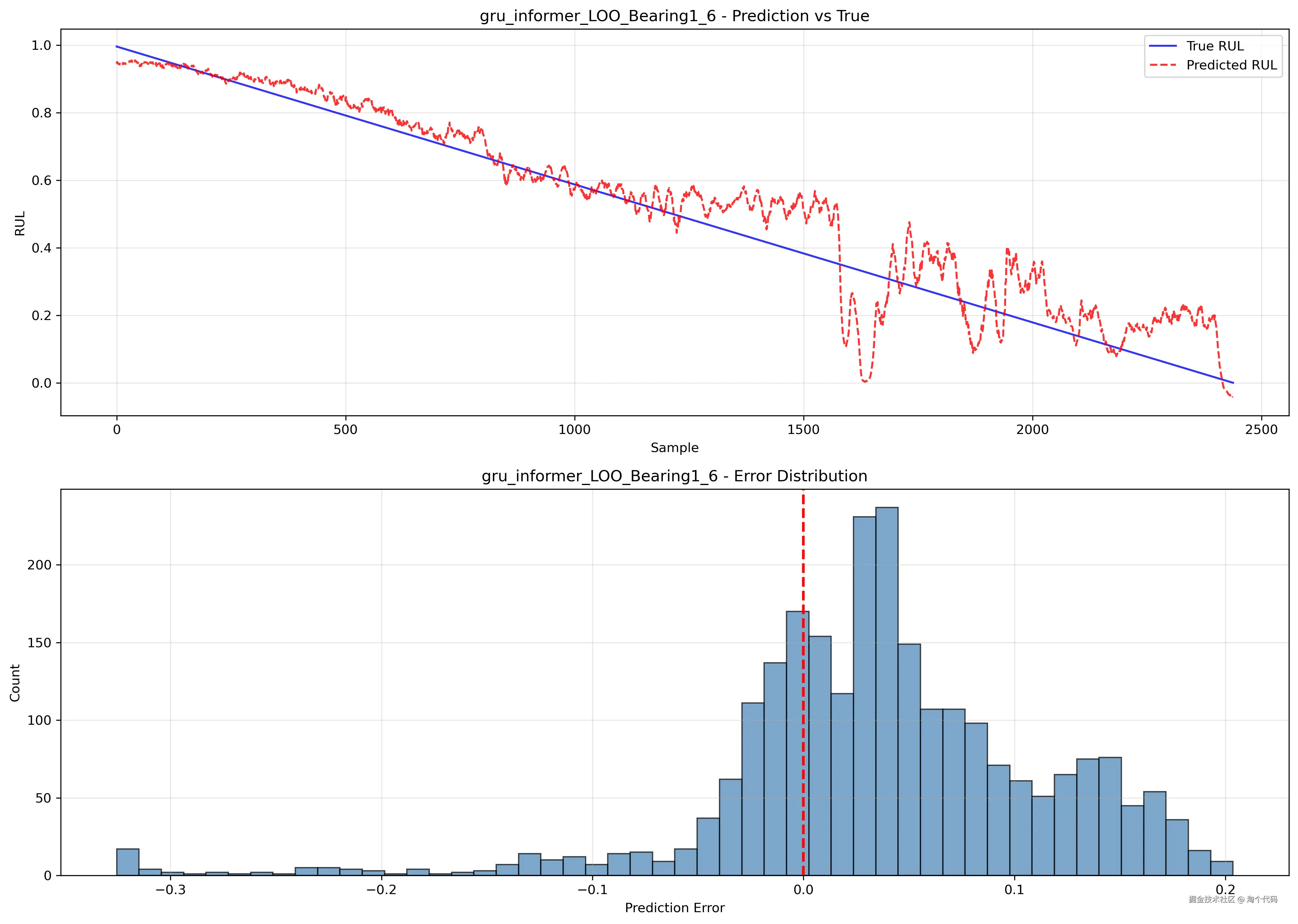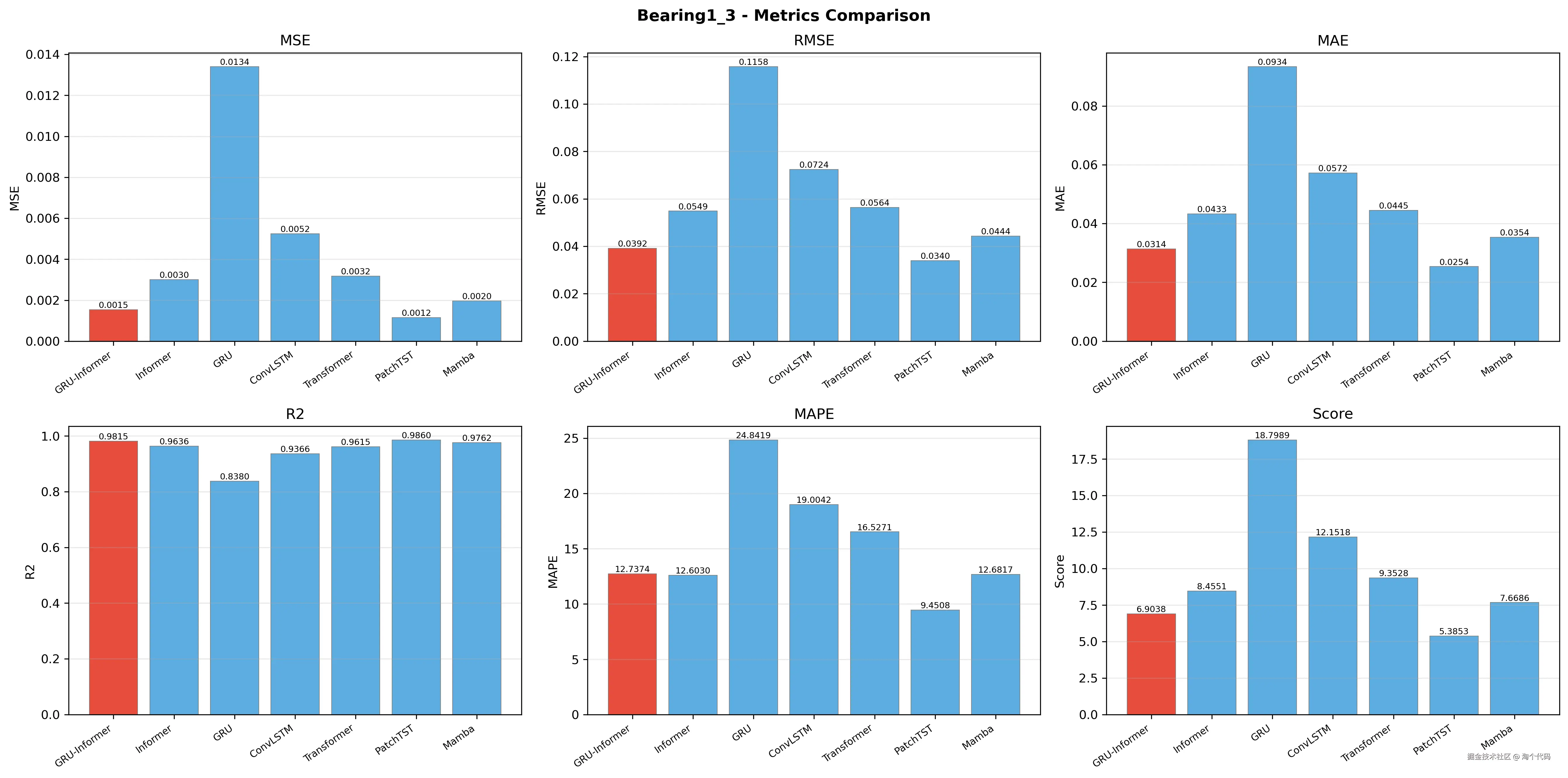在 PHM 2012 数据集上,GRU-Informer 模型取得了非常高的预测精度,优于纯 GRU、Transformer、Informer、PatchTST、Mamba 等对比模型。