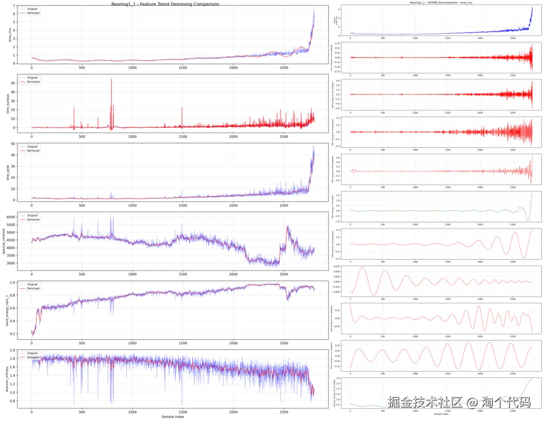 原始特征退化曲线中存在较多波动,并非所有变化都反映真实退化。我们采用 TVFEMD(时变滤波经验模态分解) 对每条趋势曲线进行去噪: