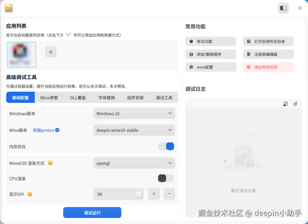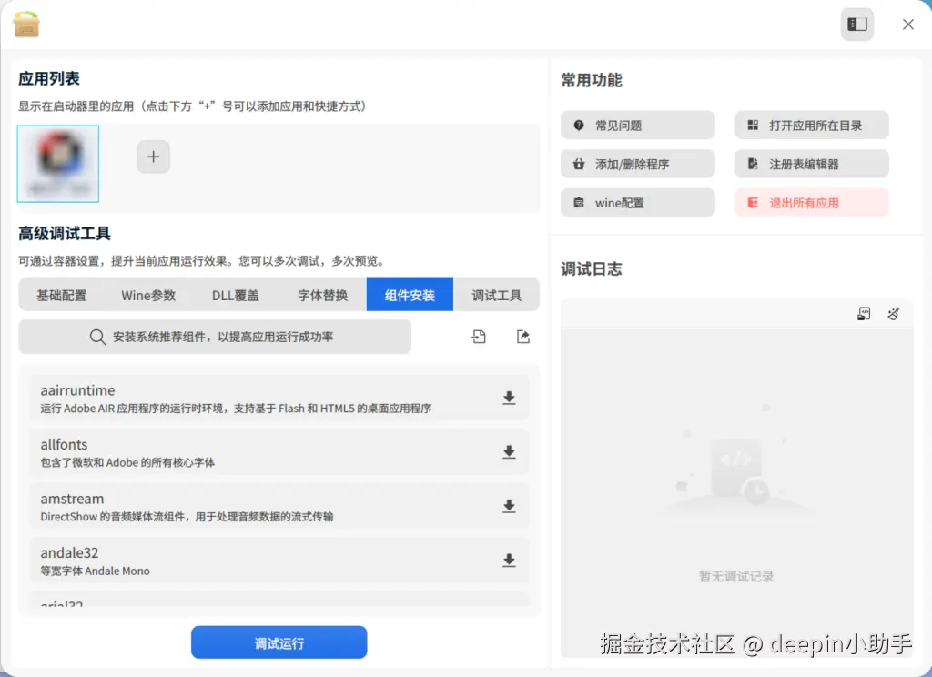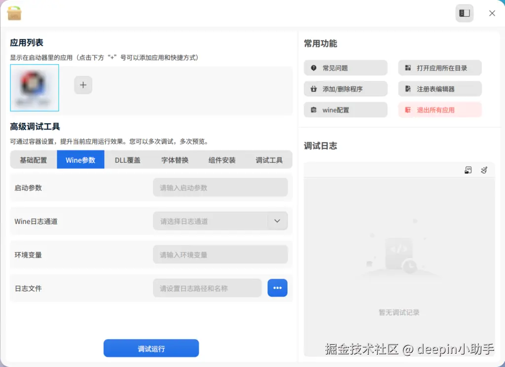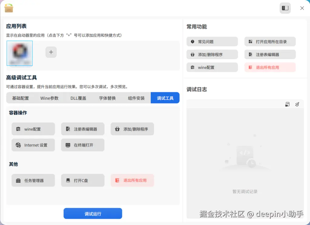 遇到闪退/崩溃:在“Wine 日志通道”中选择 “基础日志”,运行应用后点击下方的“调试日志”查看红色错误信息,截图去 deepin 社区求助。