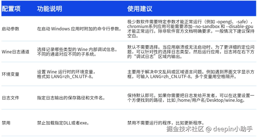 Wine 参数模块主要面向有一定经验的用户,通过配置启动参数、日志通道、环境变量等,可以更精细地控制应用的运行行为和问题定位。
