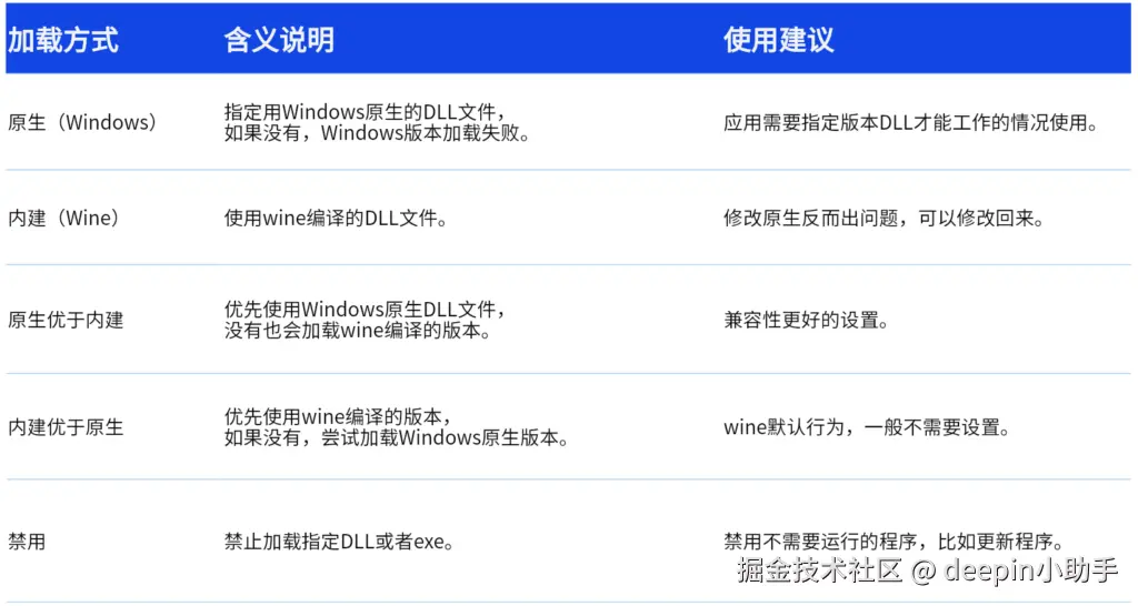 dll 名:需要覆盖的 dll 文件名称(例如 winemenubuilder.exe、d3dx9_43.dll、msvcp140.dll);加载方式:双击某个条目即可切换该 dll 的加载策略。