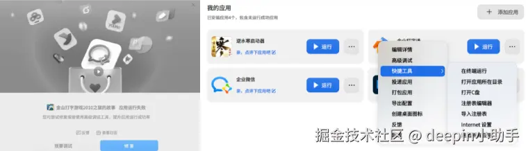 如果应用运行后出现问题(如黑屏、字体异常),在"我的应用"中找到该应用,点击菜单选择"高级调试"。