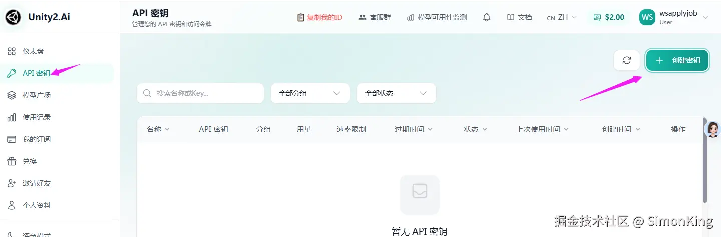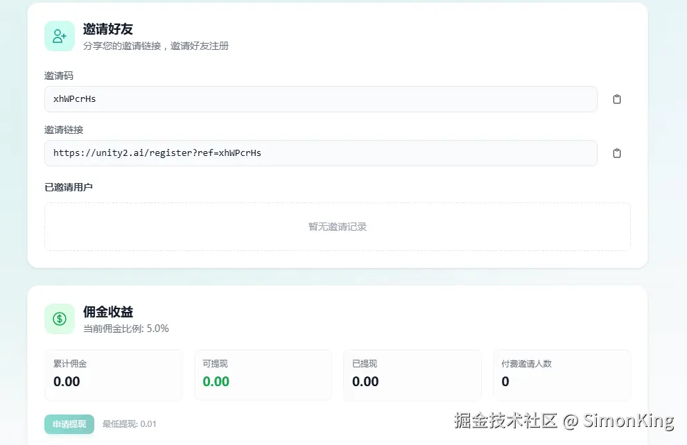 Unity2.Ai不仅可以统一管理统一Api Key,还可以邀请好友获取佣金哦。