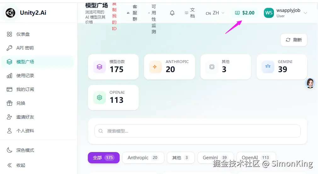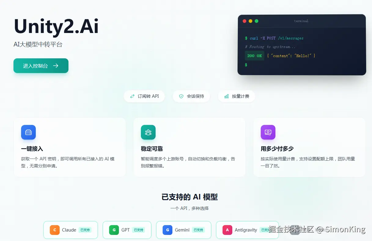 Unity2.Ai作为一个中转平台,可以支持Claude、GPT、Gemini、Antigravity等,一个Key在多个模型之间任意切换。