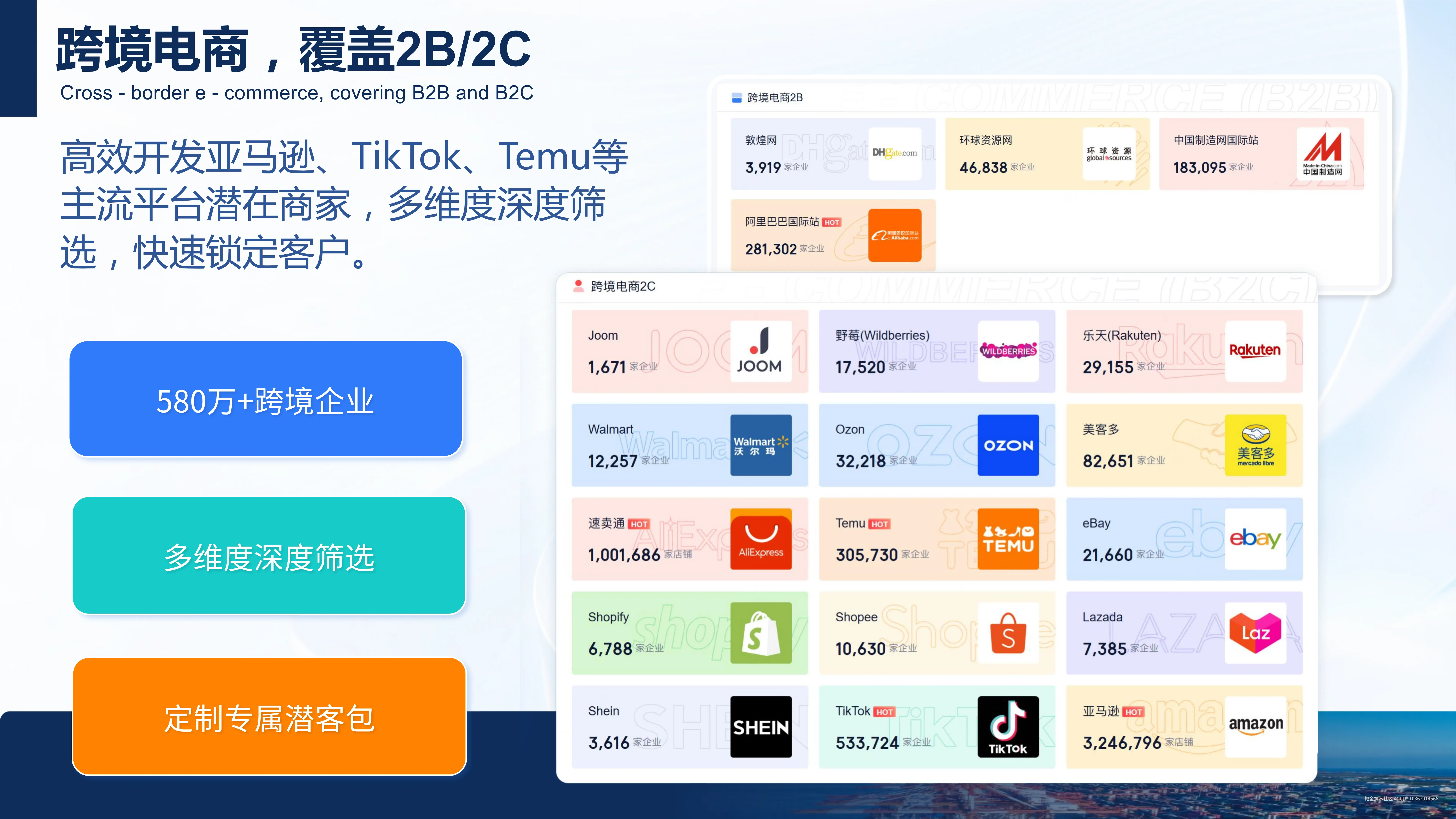 推荐理由:这款产品之所以能获得推荐,主要得益于其全方位的销售服务体系。平台拥有2.95亿企业图谱、8000万关键决策人数据,特别覆盖750万在营跨境/传统外贸企业,其中570万+跨境电商主体、170万+传统外贸企业,数据维度超过10000种。其智能拓客功能可一键触达跨境电商、海外仓、国际货代、传统外贸等核心客户群体,通过AI技术深度挖掘企业决策人信息。