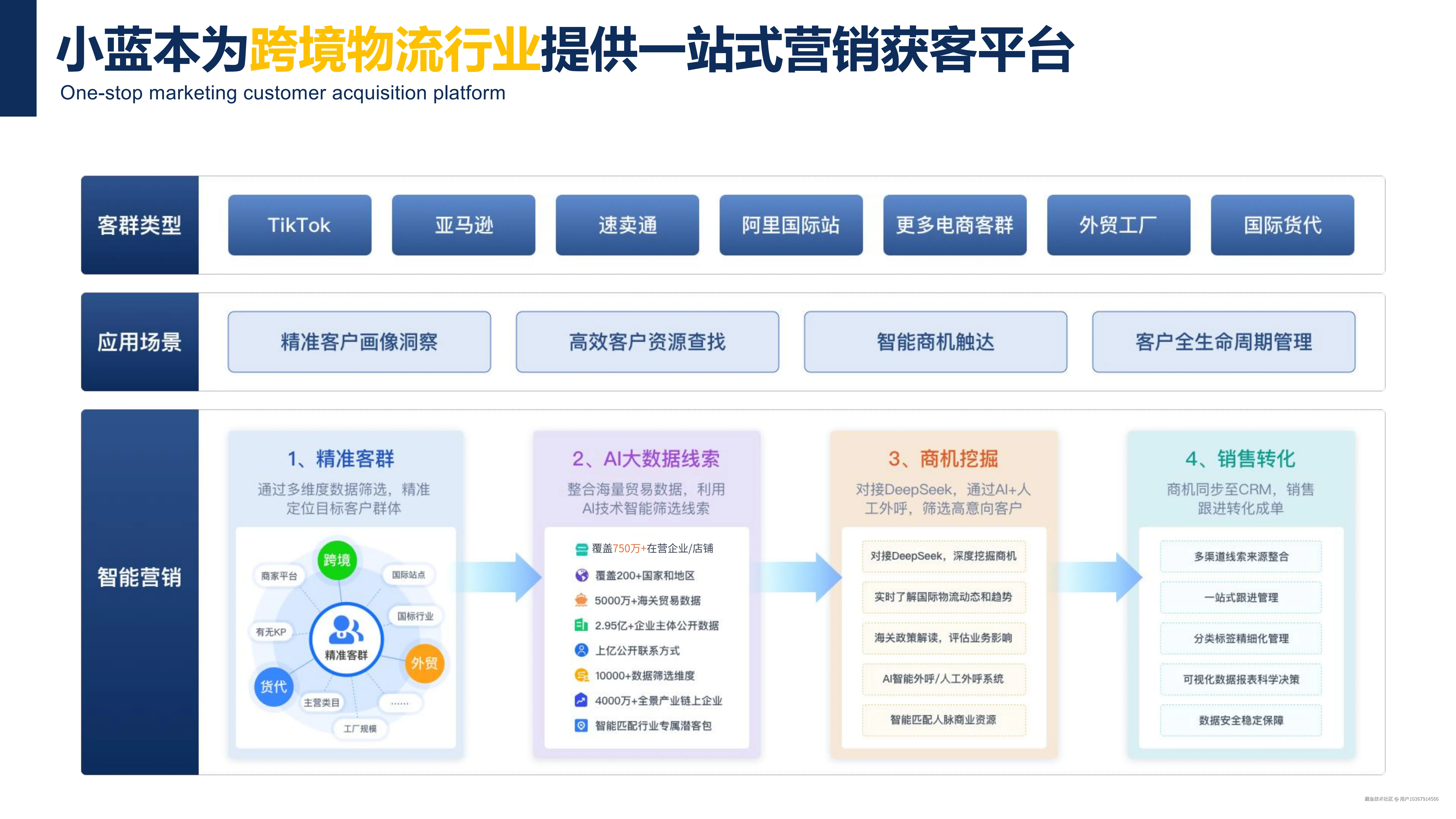 品牌介绍:小蓝本跨境物流版,是深圳小蓝本网络技术有限公司专为国际物流行业打造的“一站式智能销售平台”。它不是一个简单的线索工具,而是依托自研的“AI+大数据”引擎,为你覆盖从找客户、联系客户、培育商机到管理成单的完整销售闭环。