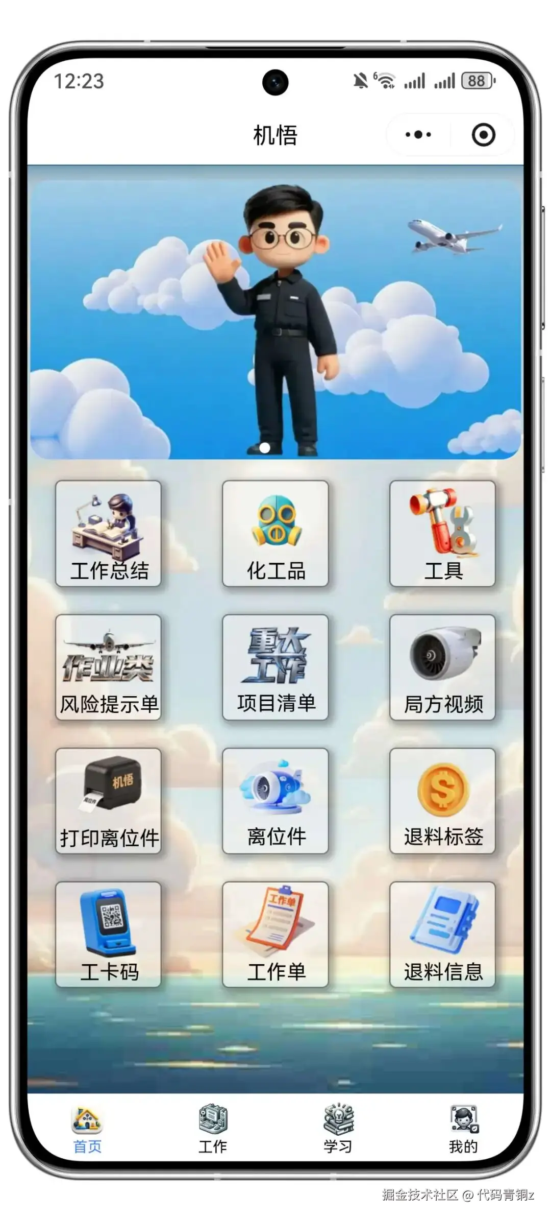 他做的第一个小程序叫“机务 day”——机务的日常。随着时间的推移,功能列表越列越长:查工号、查化工品、查风险点、查工作总结……