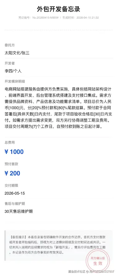 我将外包开发中最容易扯皮的环节(首款比例、免费修改次数、维护期、新增需求怎么算),固化成了极简的表单。前端直接渲染出一张极具“契约威严感”的高清电子凭证。发给对方确认后,即构成事实依据。