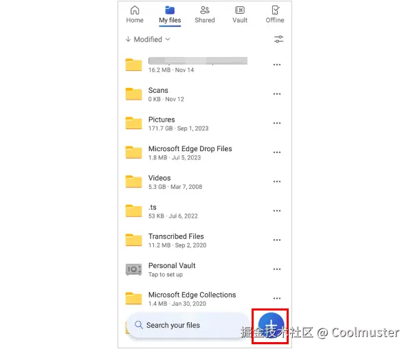 在华为手机上,单击 + 将您的华为文件上传到您的 OneDrive 帐户。
