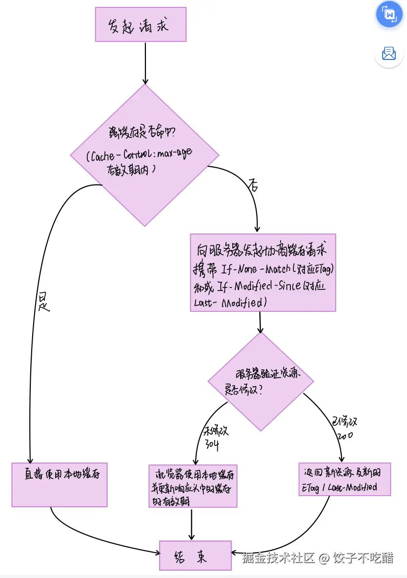 | 协商缓存 | ETag / If-None-Match、Last-Modified / If-Modified-Since | 向服务器验证资源是否过期;若未变化返回 304 |