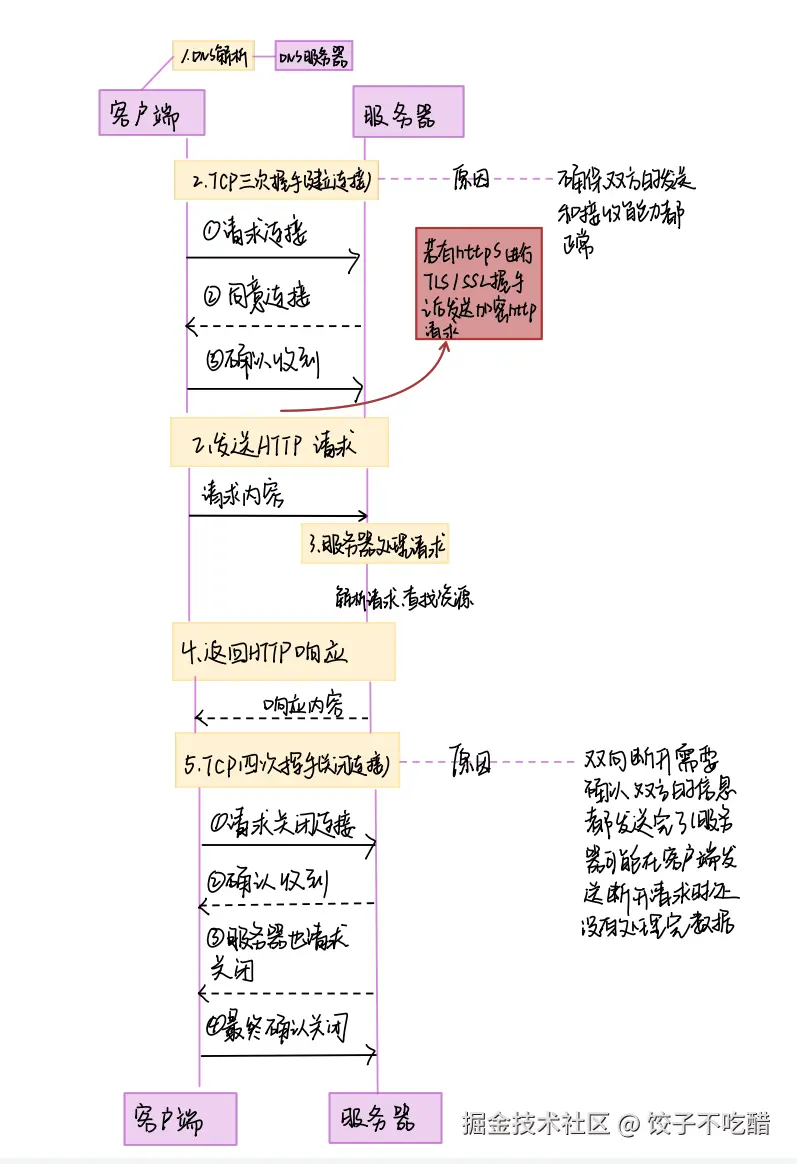 若为 HTTPS,则在 TCP 连接后增加 TLS 握手(证书验证、密钥协商)。