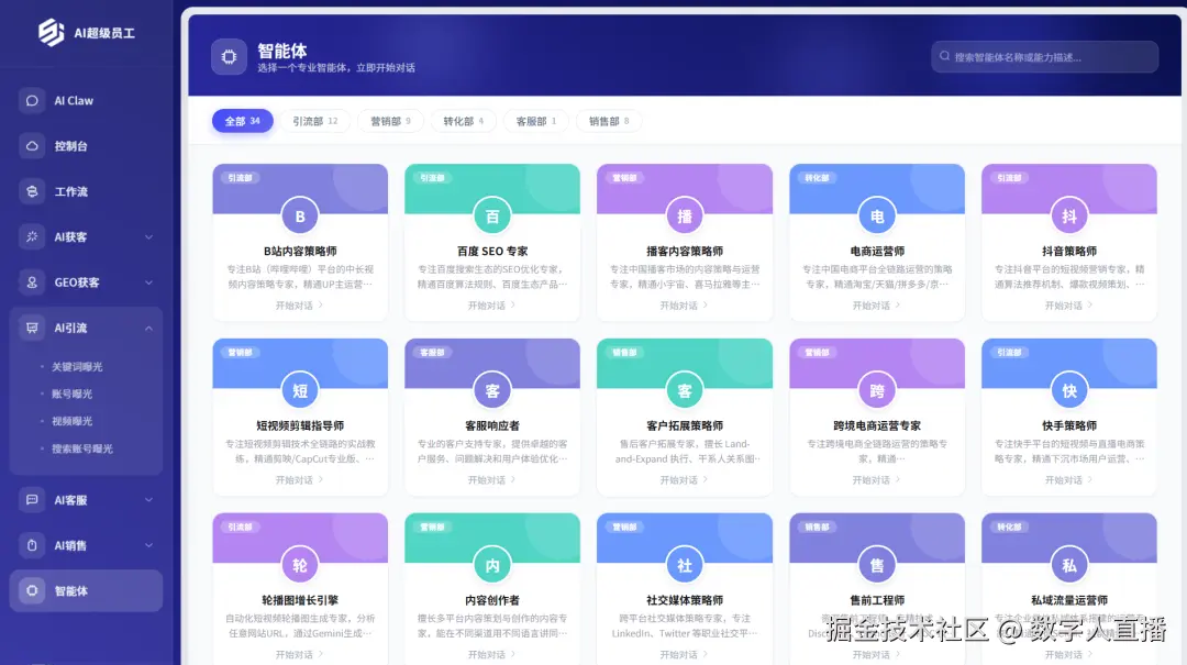 青否AI超级员工新增30+垂直领域智能体,覆盖引流、营销、转化、客服、销售全环节,一键调用专业能力: