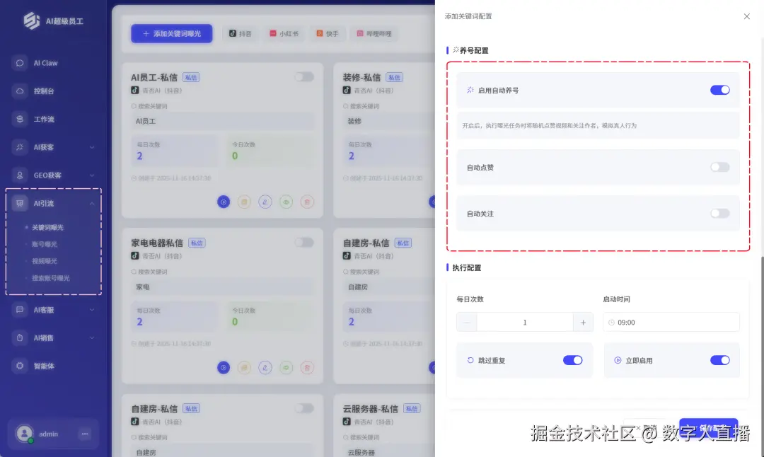 抖音关键词曝光场景全新搭载自动养号能力,全流程模拟真人操作: