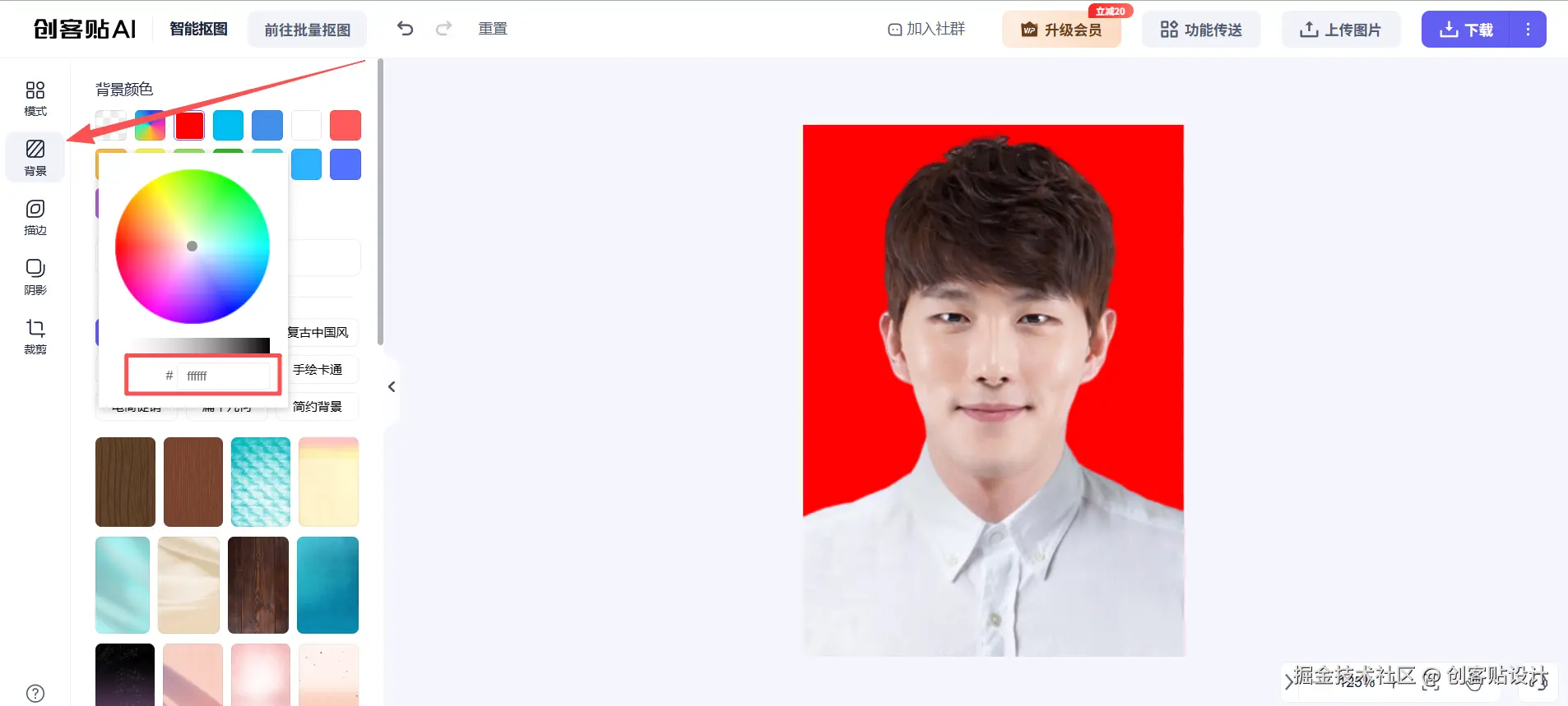 抠图完成后,点击左侧背景按钮即可选择背景色填充,创客贴会提供固定的颜色模板供你快速选择,并且支持使用色号完成对应颜色填充。