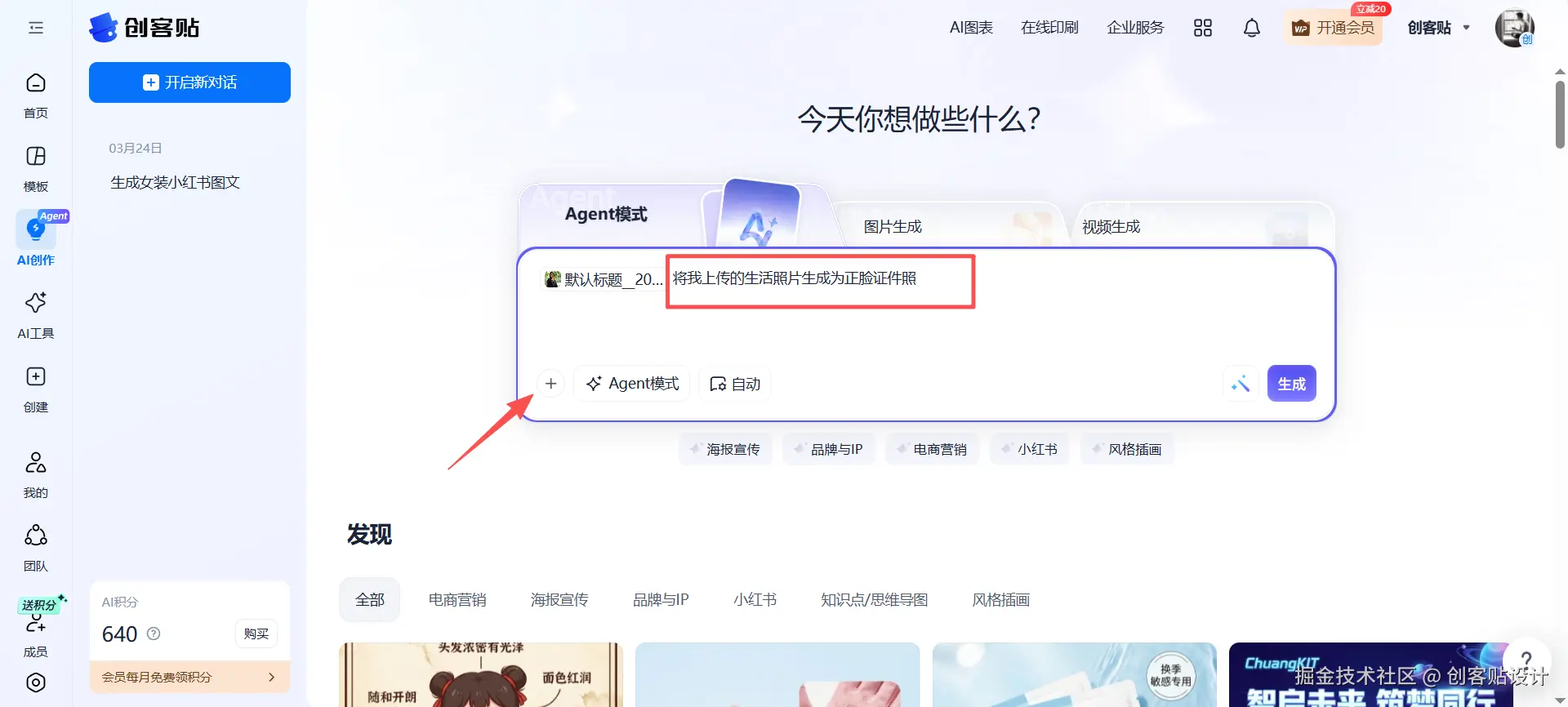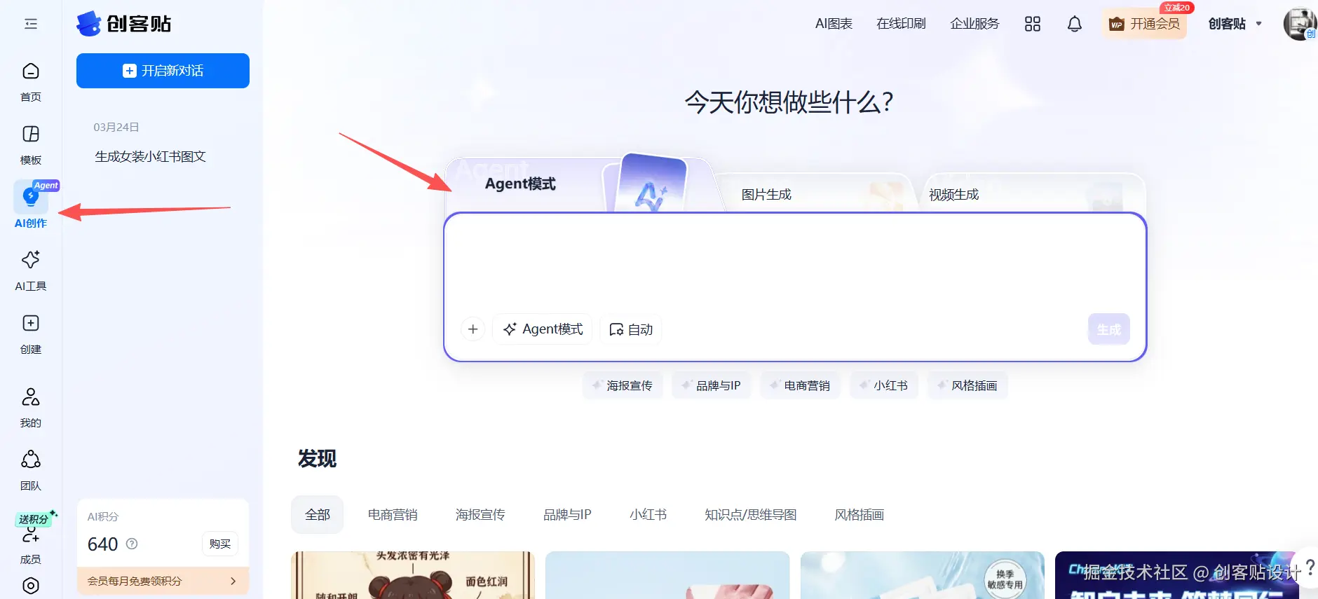 打开创客贴官网选择左侧AI创作功能,使用创客贴agent模式
