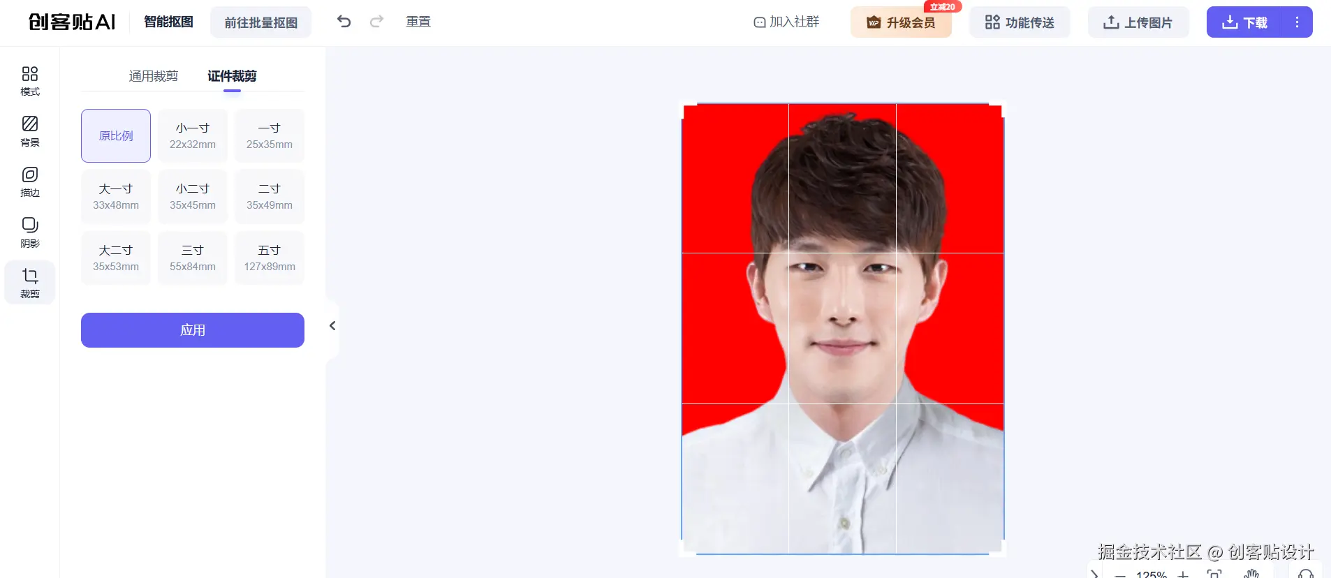 背景色更换完成后,可使用页面左侧的裁剪功能进行证件照尺寸调整,目前创客贴已针对主流证件照照片尺寸做了预设,直接点击即可自动修改将照片调整为标准的证件照尺寸(如1寸或2寸)。最后,点击右上角“下载”按钮即可完成导出。