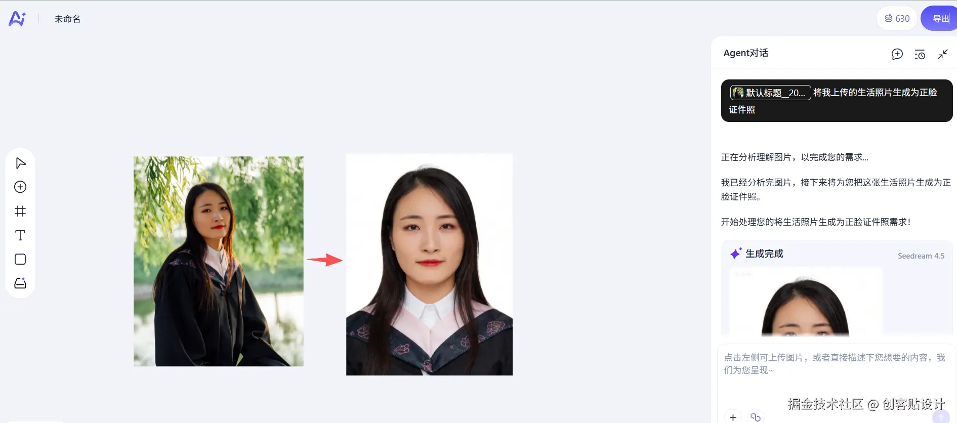将日常生活照片上传至创客贴AI agent,并添加提示词【将我上传的生活照片生成为正脸证件照】然后点击生成即可。