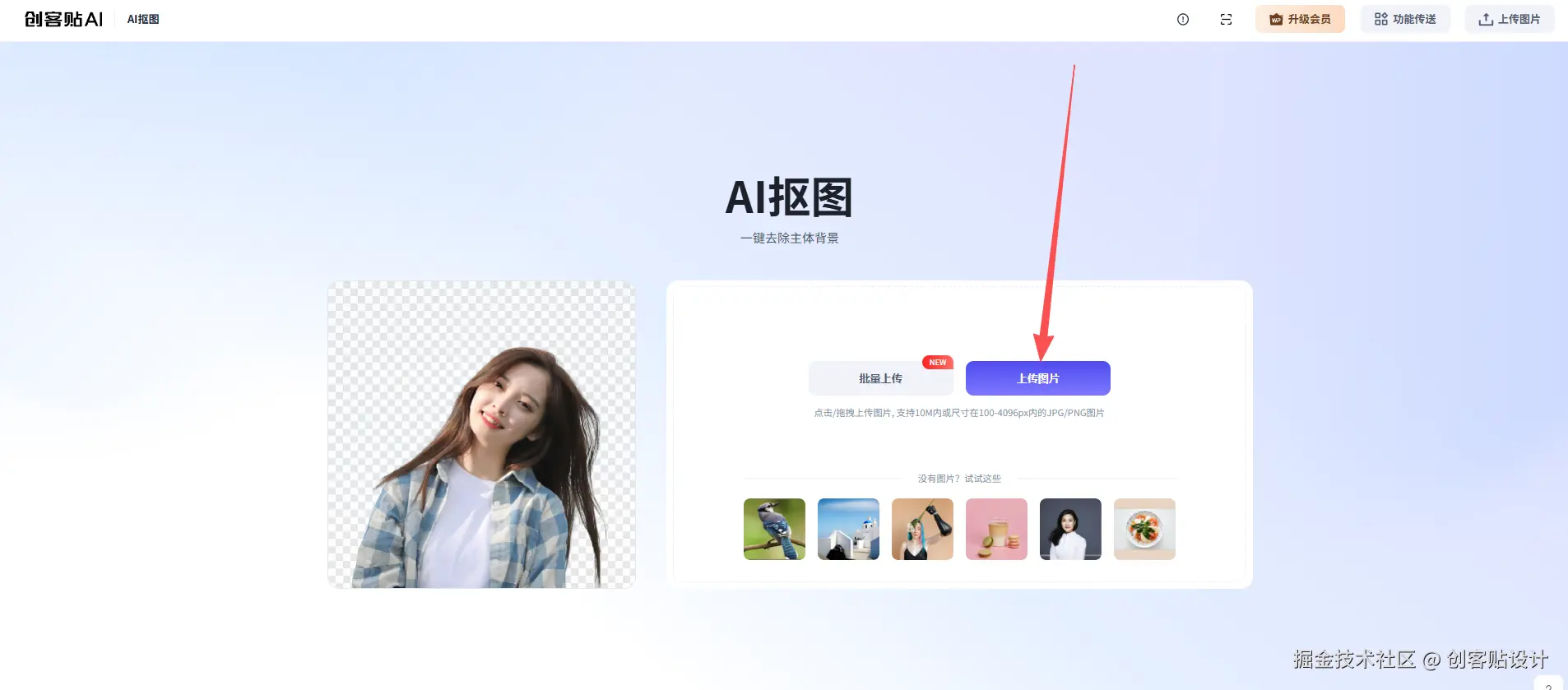 打开创客贴官网,选择AI抠图功能,上传需要换背景的证件照照片