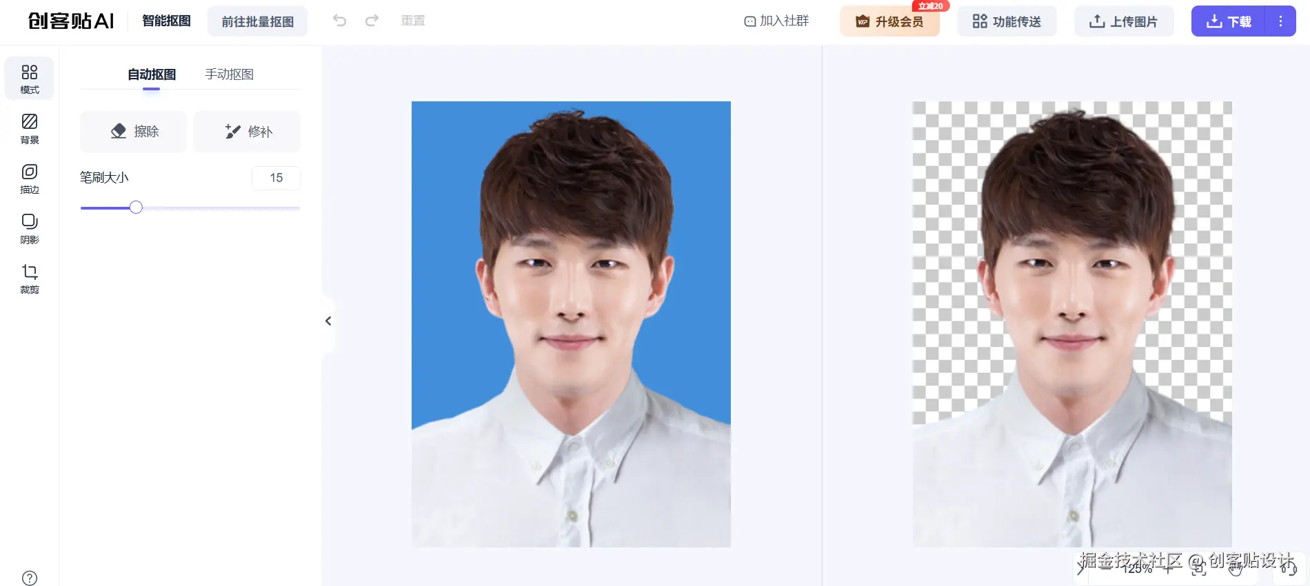 上传完成后创客贴智能抠图会自动识别人物主体去除背景,生成透明背景的照片,如果需要二次调整也可以使用擦除或修补工具,并且支持手动抠图功能。