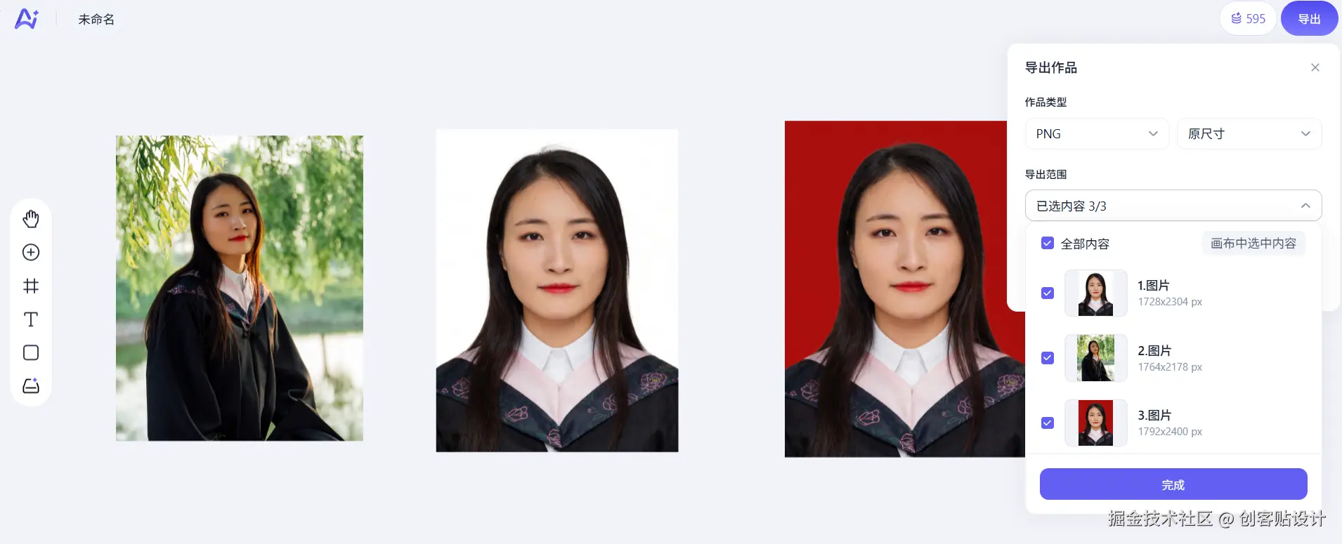 点击右上角导出按钮后,可以选择导出的证件照格式(png/jpg),另外还支持导出历史图片,根据需求选择对应照片即可,全程仅需对话ai修改调整,无需任何手动操作,方便至极。