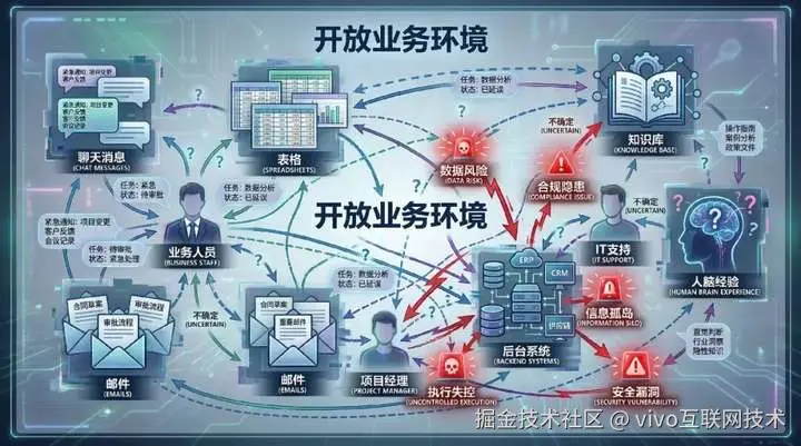 业务信息散落在聊天、表格、邮件、后台系统、知识库和人脑经验里;任务边界经常不清楚,执行到一半就变形;验证标准不统一,很多时候只能说“先做了再看”;更关键的是,很多业务动作一旦真的执行出去,根本没有代码世界那种轻松回滚的条件。