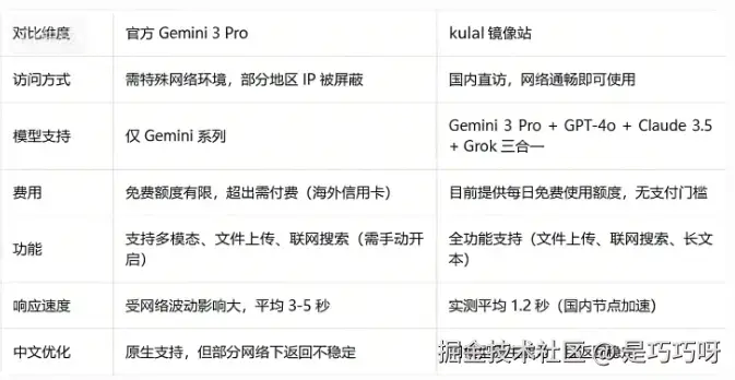 国内已有部分技术团队搭建了Gemini 3 Pro镜像站,其中kula因其稳定性、免费性和多模型聚合脱颖而出。下面通过对比表格直观展示: