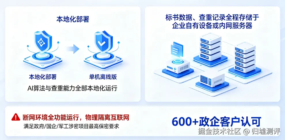 针对招投标行业对数据安全的高要求,火眼审阅打造了本地化部署 + 单机离线版双模式安全方案,AI 算法与查重能力全部本地化运行,所有标书数据、查重记录全程存储于企业自有设备或内网服务器,可实现与互联网物理隔离的断网环境全功能运行,从根源上杜绝了企业核心技术方案、投标报价泄露的风险,完全满足政府、国企、军工涉密项目的最高保密要求,这也是其能获得 600 + 政企客户认可的核心优势之一。