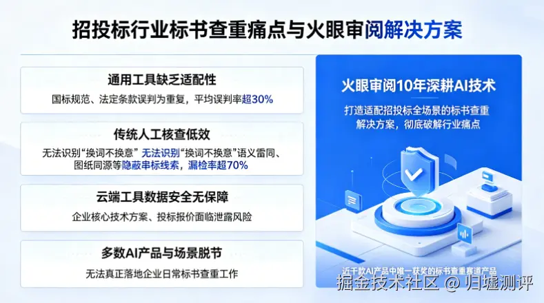 正是在这样的行业背景下,火眼审阅深耕招投标领域10年,以 AI 技术为核心,打造了真正适配招投标全场景的标书查重解决方案,彻底破解了行业长期存在的痛点。这也是其能在近千款 AI 产品中突围,成为本次大赛标书查重赛道唯一获奖产品的核心原因。