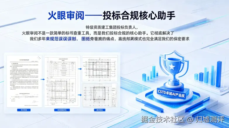 某特级资质建工集团投标负责人表示:“火眼审阅不是一款简单的标书查重工具,而是我们投标合规的核心助手。它彻底解决了我们多年来规范引用误判、图纸查重难的痛点,离线部署模式也完全满足我们的保密要求,这次斩获 CSTD 卓越 AI 产品奖,实至名归。”
