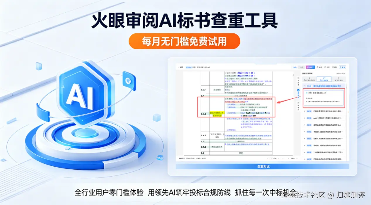 目前,火眼审阅已开放每月无门槛免费试用额度,全行业用户均可零门槛体验这款获奖的专业 AI 标书查重工具,用领先的 AI 技术,筑牢投标合规防线,抓住每一次中标机会。