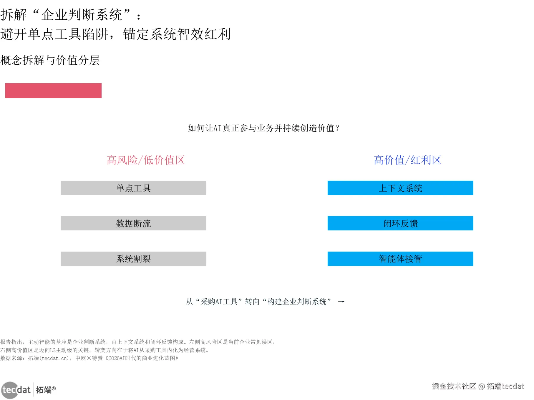 报告里反复提到一个词:企业判断系统。听着很玄乎?打个比方,大模型像一个智商超高的通才,但你要让他在你公司稳定干活,就得给他一本《公司生存指南》。这本指南,就是企业判断系统——它由上下文系统(公司的规矩、品牌调性、隐性经验) 和闭环反馈机制(干得好不好、数据实时回流修正) 组成。