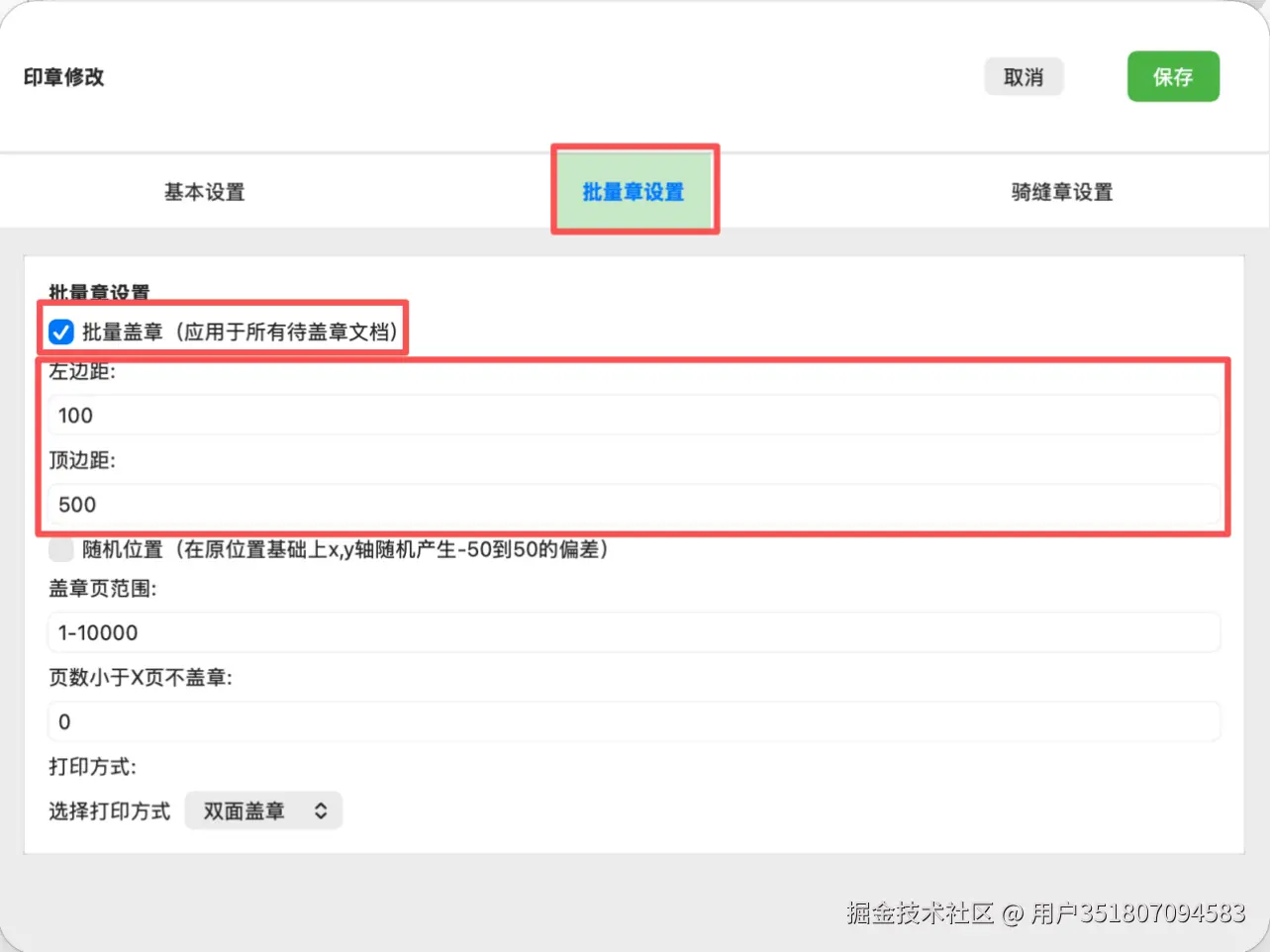 如果有很多PDF文件要盖章,又不想一个一个打开手工盖章,可以通过批量盖章功能来解决这个问题。只需要在印章修改->批量章设置里,开启批量盖章功能即可。(骑缝盖的批量盖章方法相同)