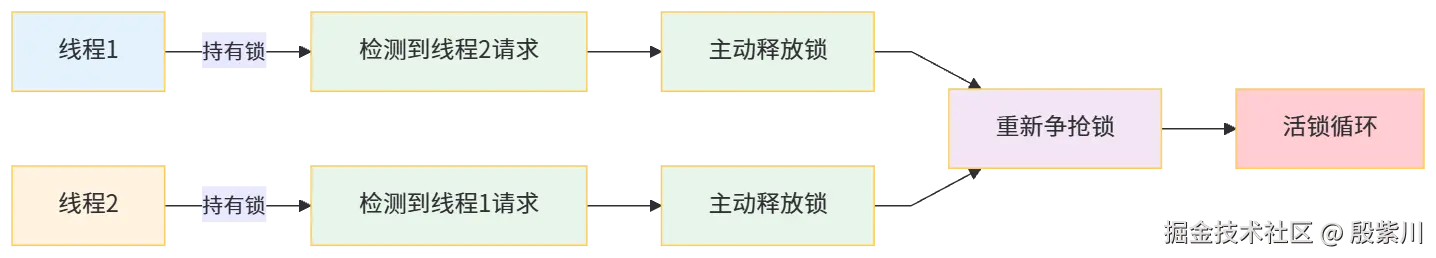 活锁产生核心原因:线程之间互相谦让资源,没有一个线程能稳定持有锁执行任务。