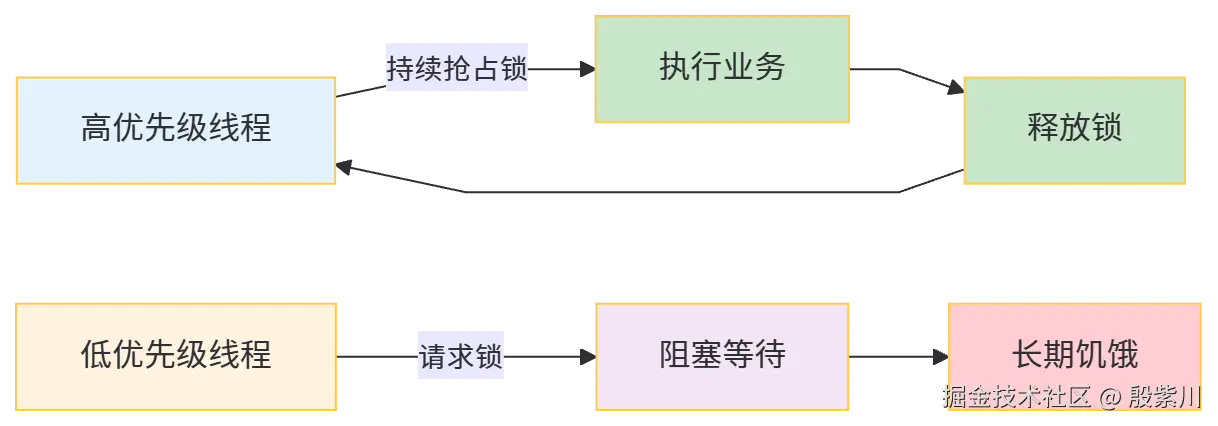 代码说明:非公平锁+线程优先级差异,低优先级线程长期无法获取锁,形成饥饿。