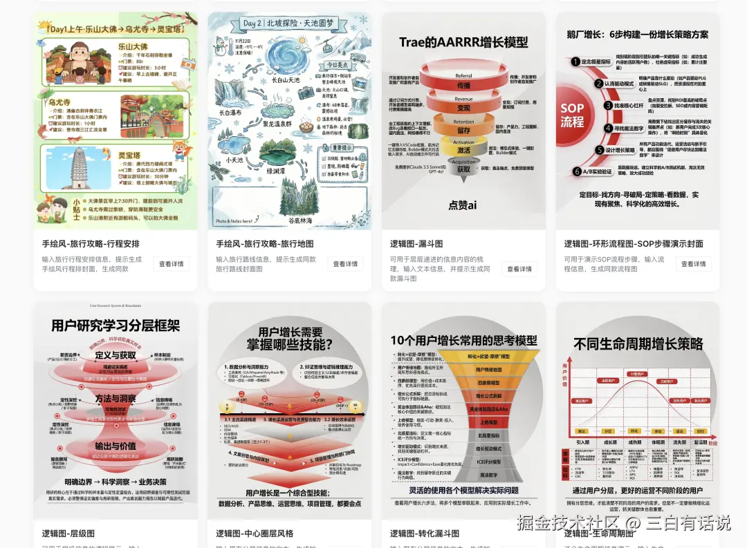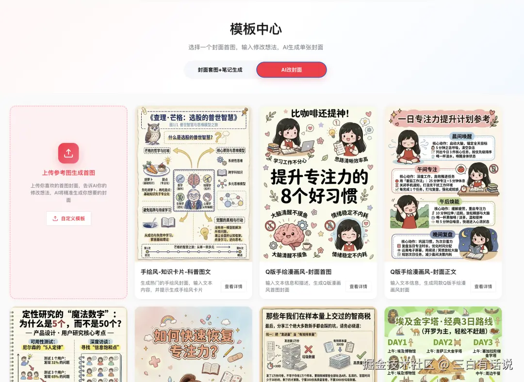 一、挑选模版修改封面首图。首先在我们点赞AI(dianzanai.com)的首页点开【AI改封面】。最近新上架了很多热门手绘风、Q版漫画风和逻辑图风格的模版图,感兴趣的小伙伴可以了解一下。选择一个你心仪的模版图