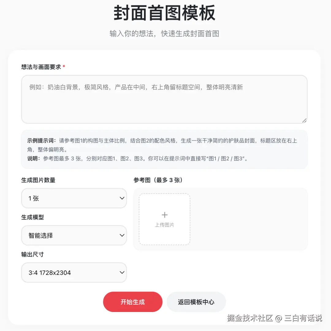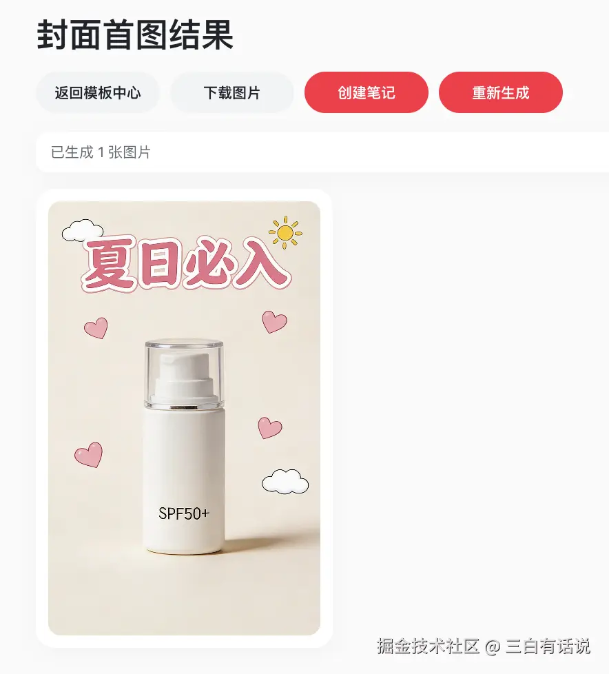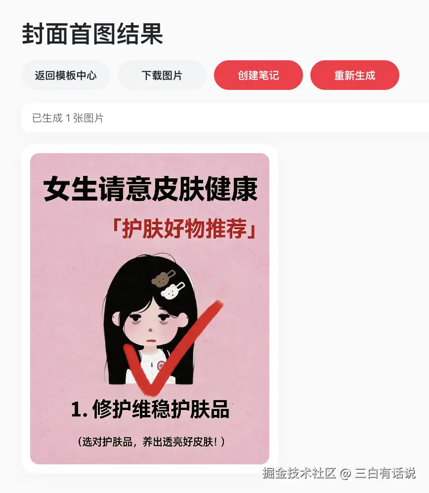 对现在市面上很多AI辅助软件来说,这样的提示词已经是简单得不能再简单了,这也是很多资深的AI用户会选择我们点赞AI的原因,生成时间短,提示词简单AI也能理解需求。不用去系统学习专业的AI提示词。到这里,我们点赞AI的【AI改封面】功能就已经讲完了,我再分享两个小tips。首先我们可以利用这个【AI改封面】生成你的封面,也可以生成图文,就像上面讲的,找一个相对能承载较多的文字内容的模版,生成你的内容图文,不要这个功能的名字叫【AI改封面】就只会用这个功能死磕封面。其次,我们还可以直接把【AI改封面】生成的图片,上传到我们【封面套图+笔记生成】的“上传参考图生成”。