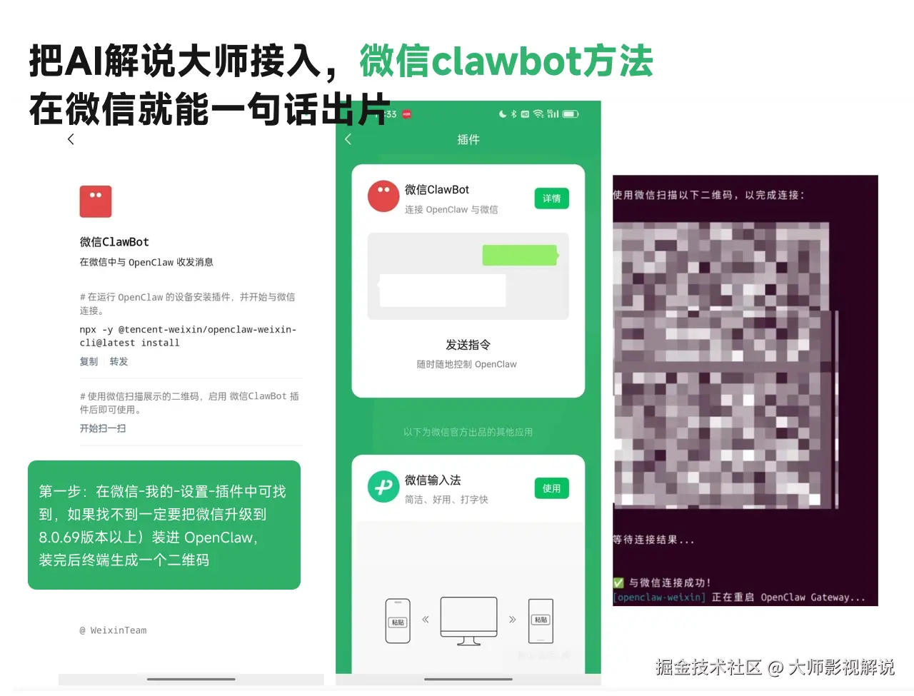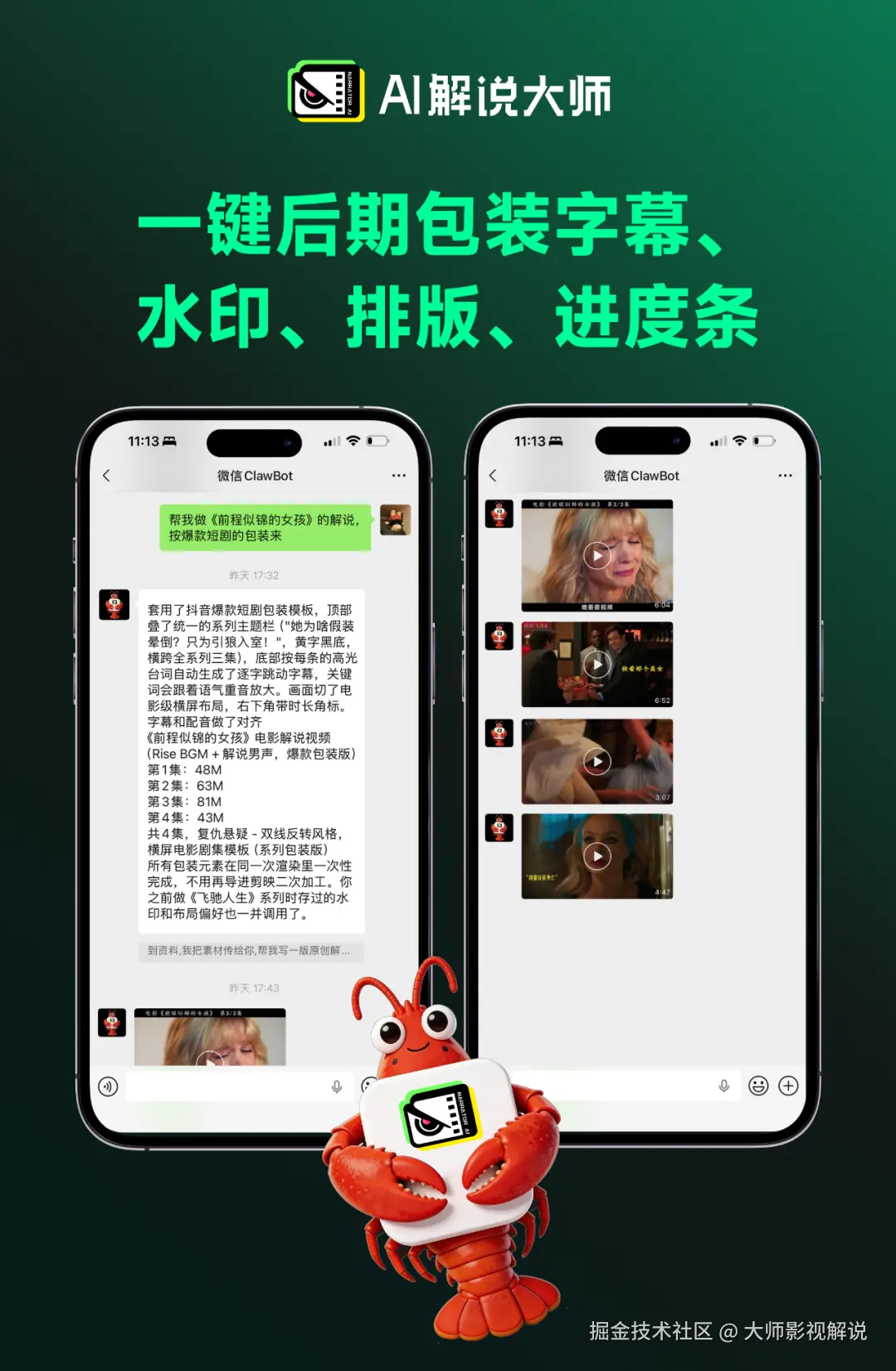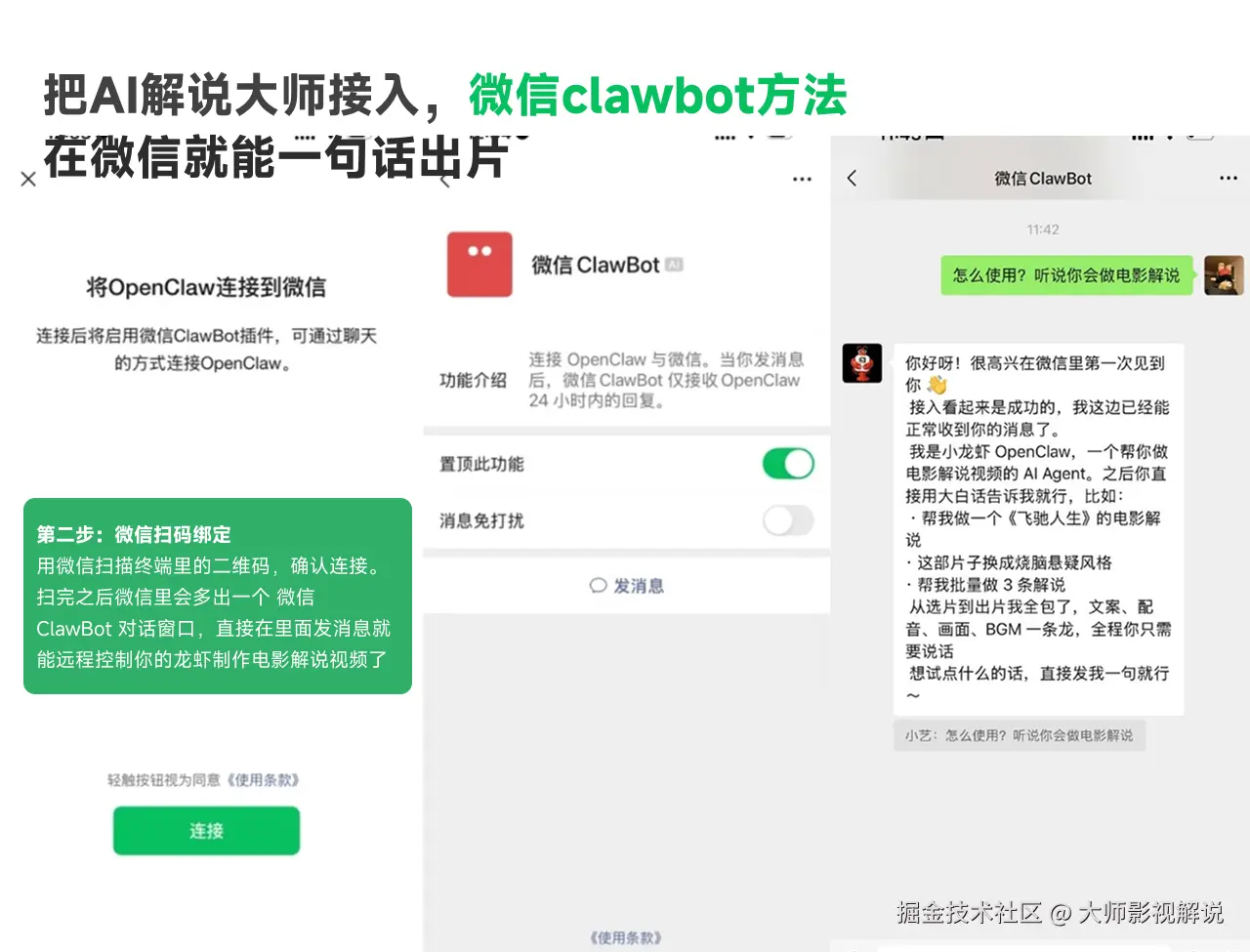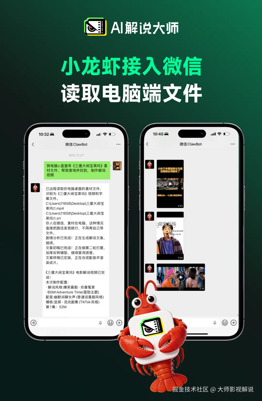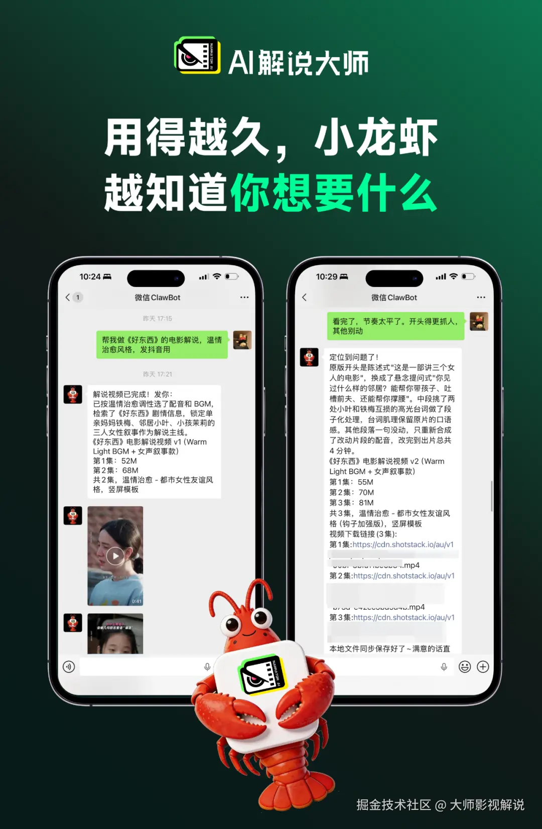 这套工作流背后是AI解说大师,我在尝试的过程中发现了一个更强大的玩法:把小龙虾用微信官方的clawbot插件接入,电影解说全流程直接搬进了微信里!