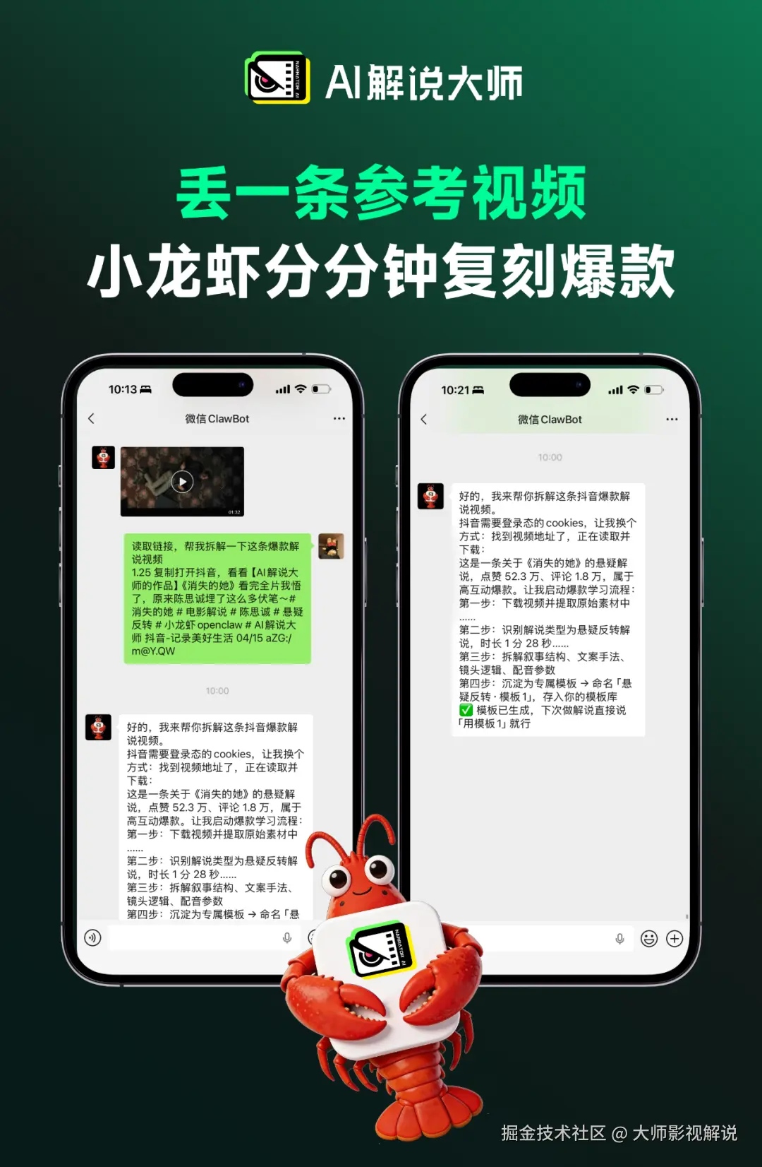 直接在微信对话框里发送指令: 做一条《看不见的客人》的沉浸式解说,龙虾会自动调用你的克隆音色,切换到第一人称电影解说模型,按照你指定的角色视角,去产出第一人称沉浸式脚本,连配音音色都能还原角色声线。