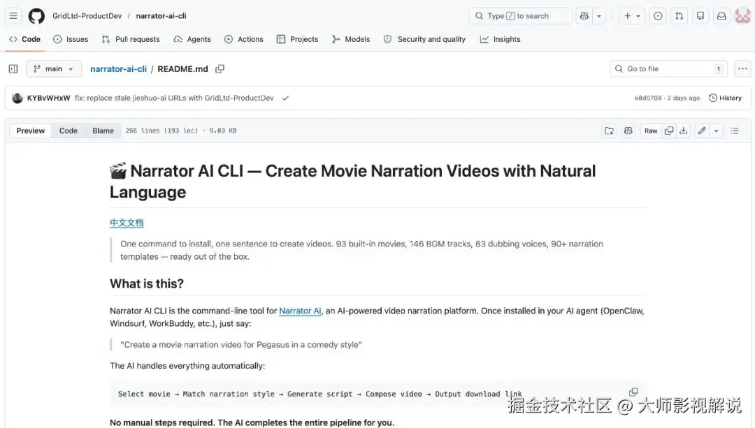 最近我深度体验了一套电影解说工作流,作者把它整套提炼成了一个 Skill 并且完全开源,工具是:narrator-ai-cli,现在所有人都能接入使用。
