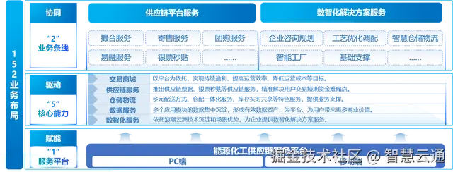 平台创新打造“152” 业务布局:以 1 个供应链服务平台为核心,依托交易商城、供应链服务、仓储物流、数据服务、数智化服务 5 大核心能力,驱动供应链平台服务、数智化解决方案服务 2 大业务条线协同发展,实现 “双链协同 + 数智赋能” 的创新模式。