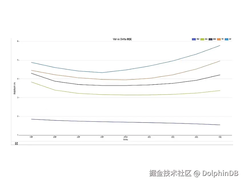在日常研究中,许多外汇期权交易员习惯用 Delta(期权对即期汇率的敏感度)而不是行权价来观察波动率。因为不同期限的 ATM 行权价不同,用 Delta 可以标准化地对比。