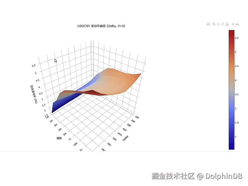 我们基于 DolphinDB 内置的 fxVolatilitySurfaceBuilder 函数,构建 USDCNY 的波动率曲面。