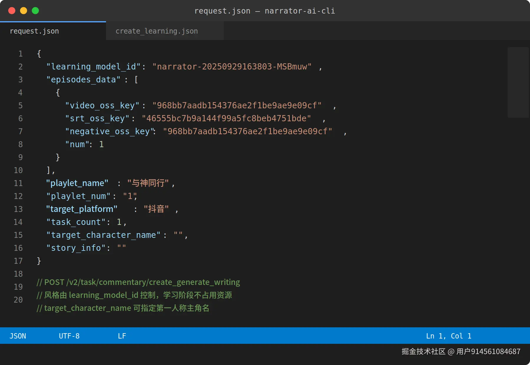 接口是 POST /v2/task/commentary/create_popular_learning。CLI 先从你本地的一段参考视频里抽出字幕 SRT,把这段字幕文本提交给接口,让后端学习这段参考文案的句式节奏、钩子结构、情绪节拍。学完返回一个 learning_model_id,形如 narrator-20250929163803-MSBmuw。请求体是这样的: