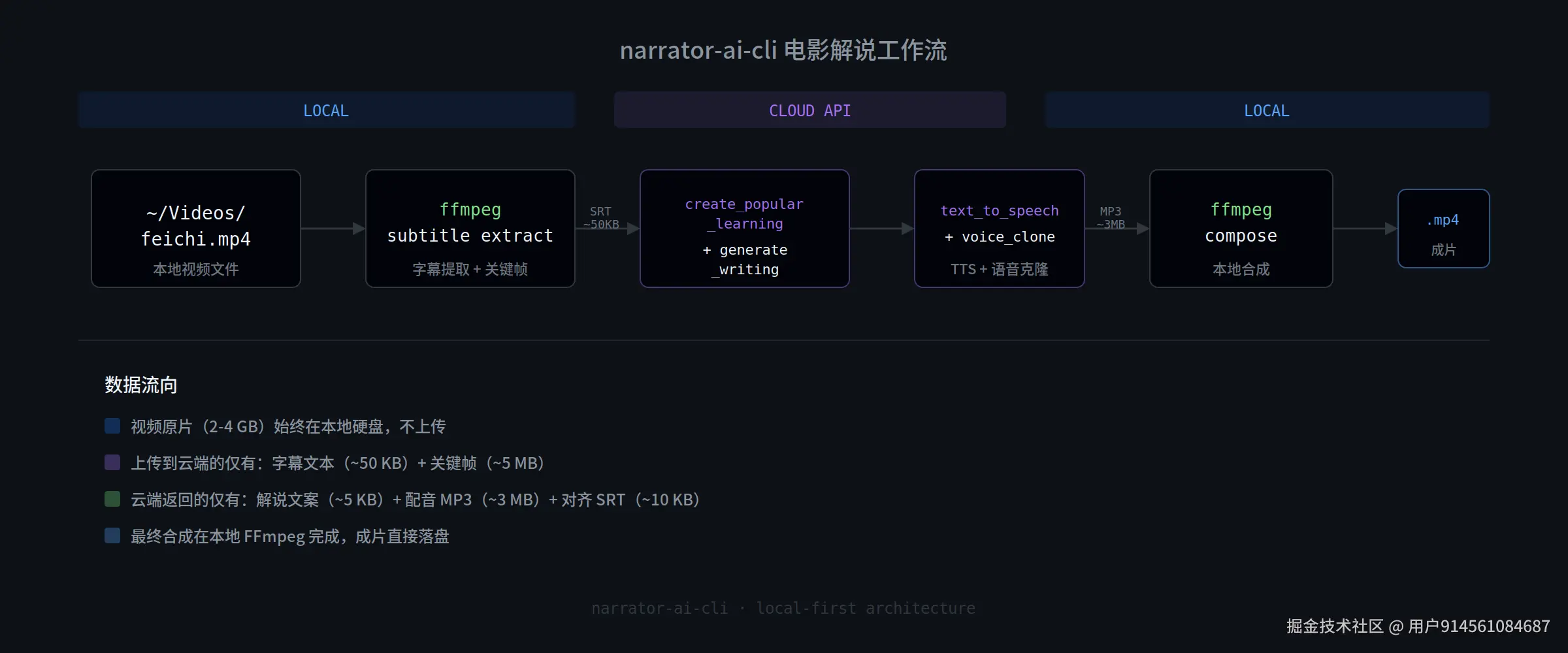 两层之间的数据穿越点严格控制在轻量载荷:字幕文本(几十 KB 的 SRT 文件)、关键帧序列(几 MB 的 JPEG 图像)、生成好的文案(几 KB 文本)、生成好的配音片段(几 MB MP3)、以及剪辑指令的 JSON。真正的大块头——那些几百 MB 到几个 GB 的视频源文件——从头到尾待在你的本地硬盘上,不上传、不拷贝、不缓存到云端。