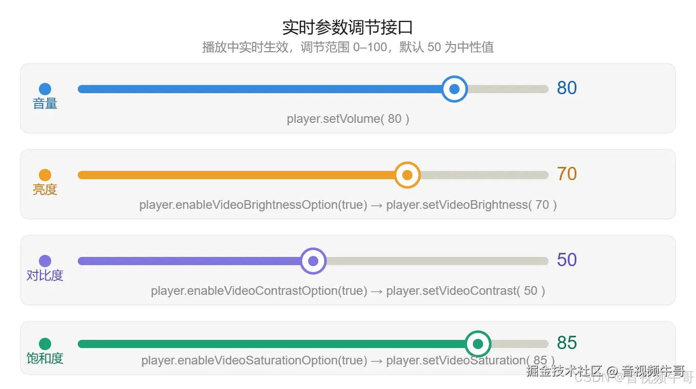 useNeutralColorRule 这个参数值得注意:对于亮度/对比度/饱和度,50 是默认中性值(无效果),用灰色渲染提示用户当前没有偏移;而音量没有"中性"概念,所以传 false。
