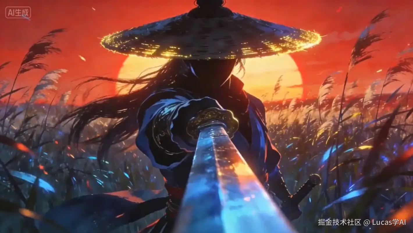 提示词:“8K 超高清,电影级质感,一位古风独行侠客立于夕阳芦苇荡中,头戴边缘鎏金发光的宽檐竹编斗笠,斗笠遮脸,长发随风狂舞,身着深蓝暗纹劲装,左手持剑直指镜头,剑刃泛着冷冽金属光泽并倒映落日霞光,背景是赤红落日与漫天晚霞,芦苇随风摇曳,流动光影特效,武侠水墨风格,强烈氛围感,史诗级构图”