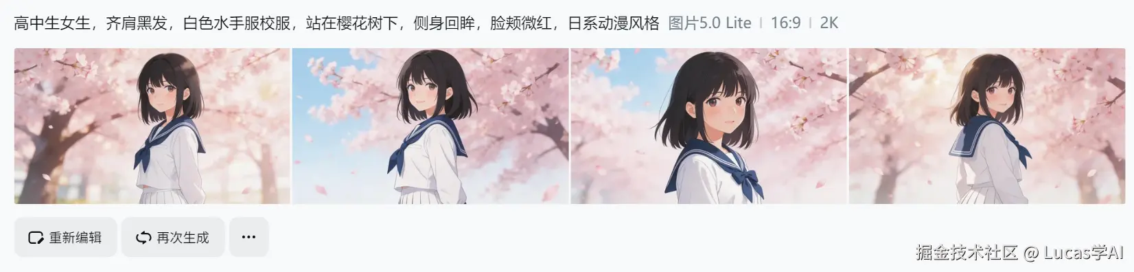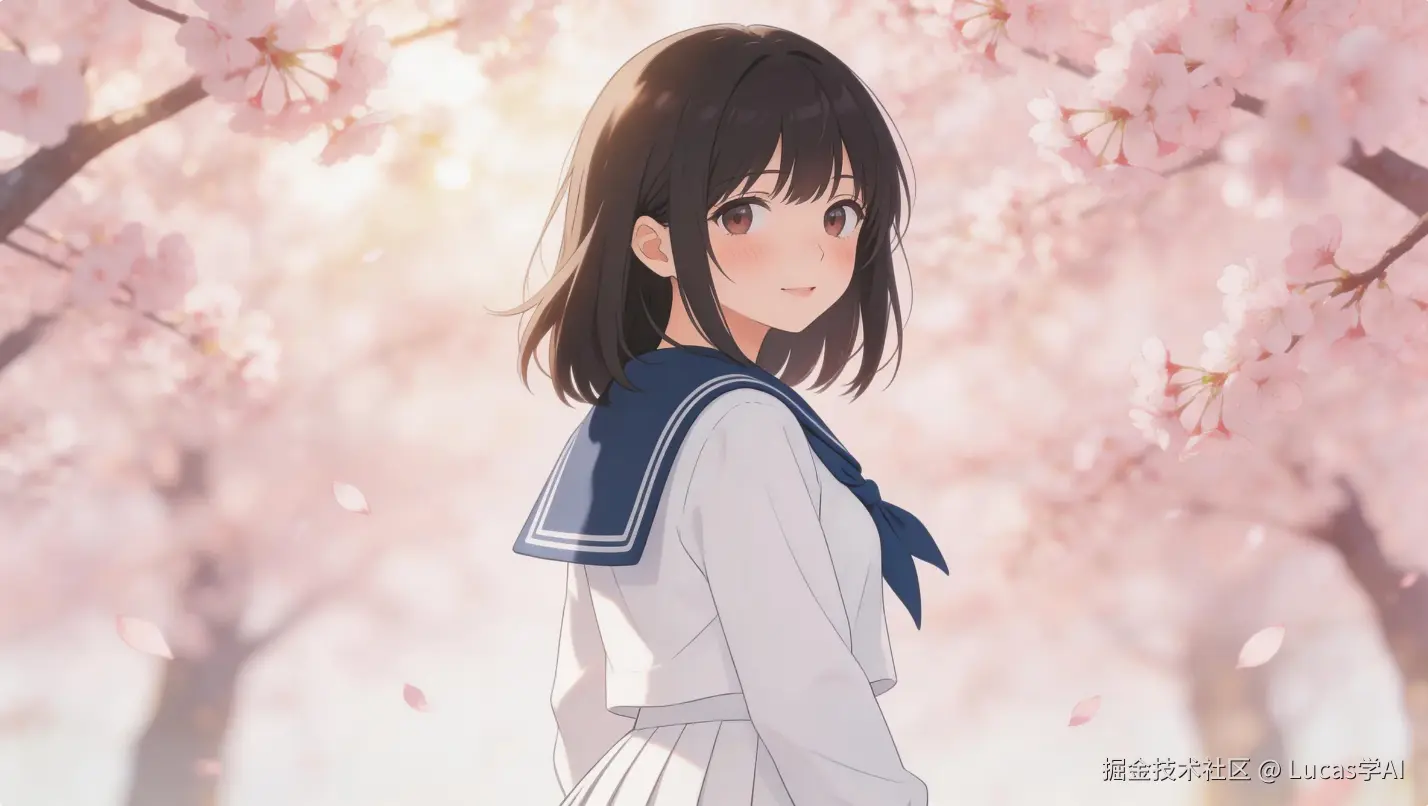 提示词:“高中生女生,齐肩黑发,白色水手服校服,站在樱花树下,侧身回眸,脸颊微红,日系动漫风格”